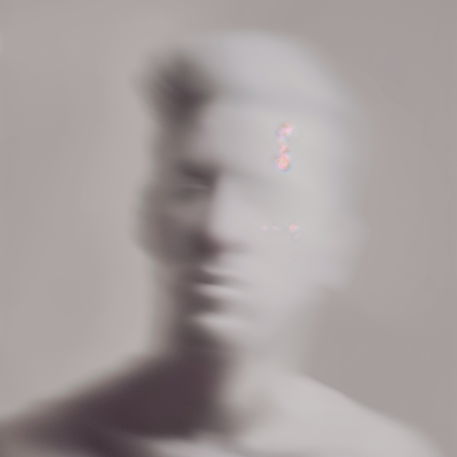 Abstract blurred portrait of a human figure with muted tones and iridescent highlights, creating a dreamlike and ethereal effect.
