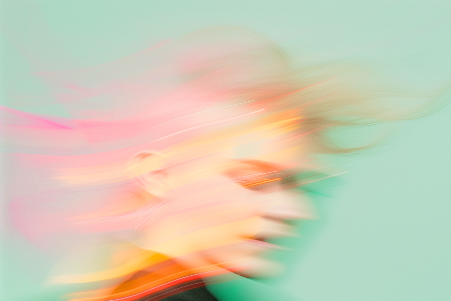 Abstract image of a blurred figure with vibrant streaks of pink, orange, and yellow light on a pastel green background.
