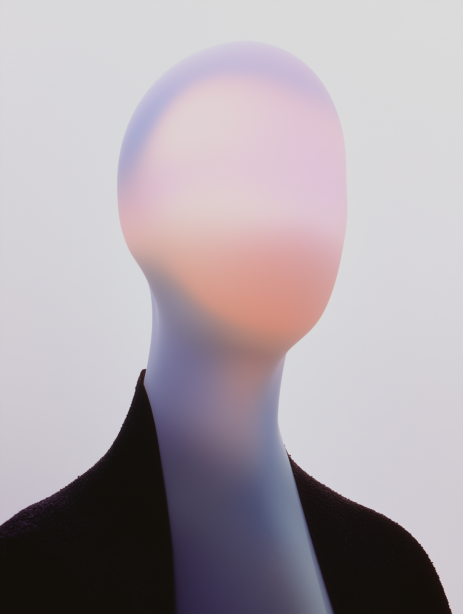 Abstract mannequin with pastel gradient face and dark garment, set against a light gray background. Minimalist and surreal design.