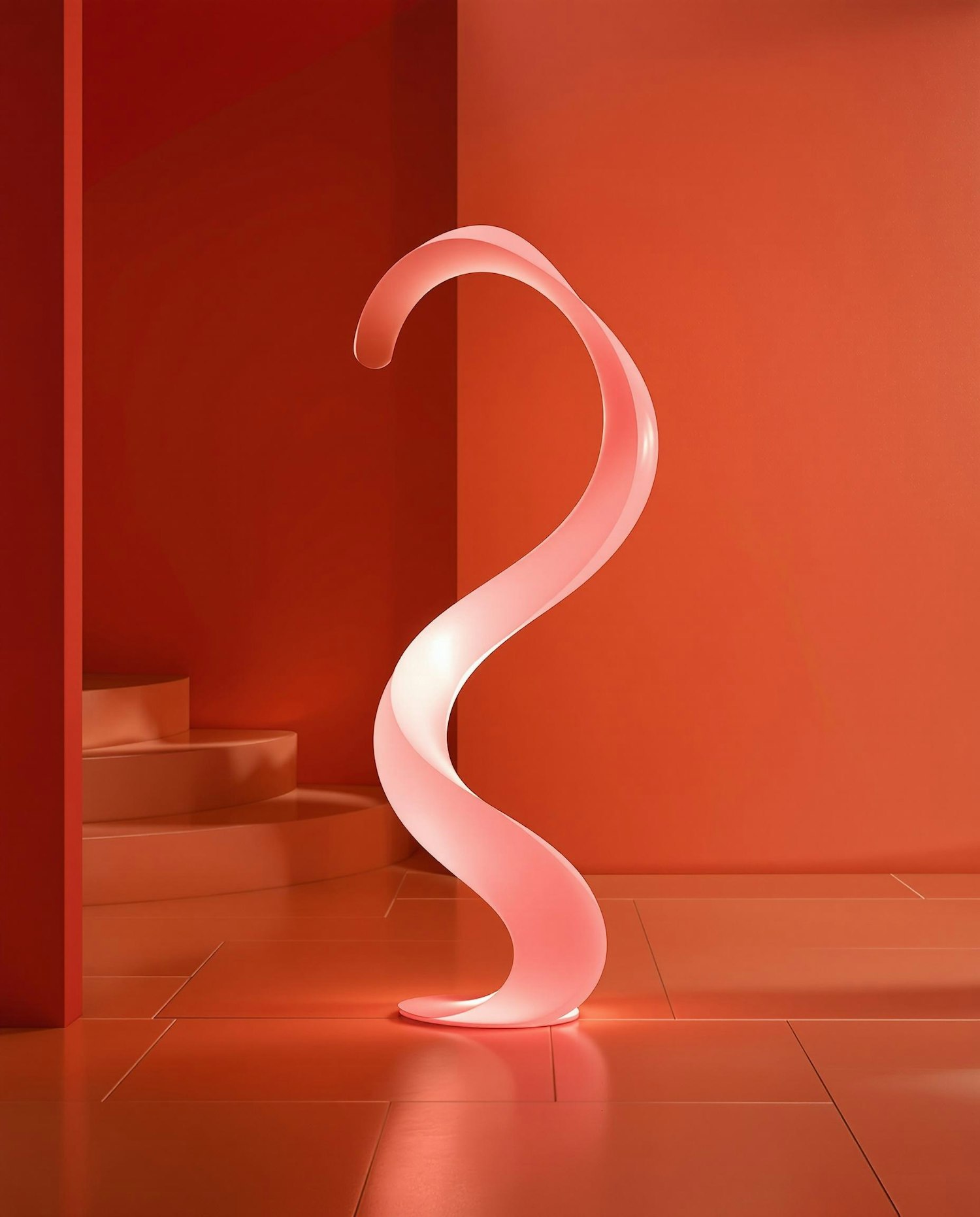 editorial product photo, dramatic studio lighting with soft shadows, carefully styled composition, bold modern background in expressive color or texture, refined materials, high contrast, clean lines, minimal-maximal art direction, luxury design magazine aesthetic a floor lamp shaped like a curved ribbon, made of translucent pink acrylic and warm light from within, standing on matte terracotta tiles with light shadows