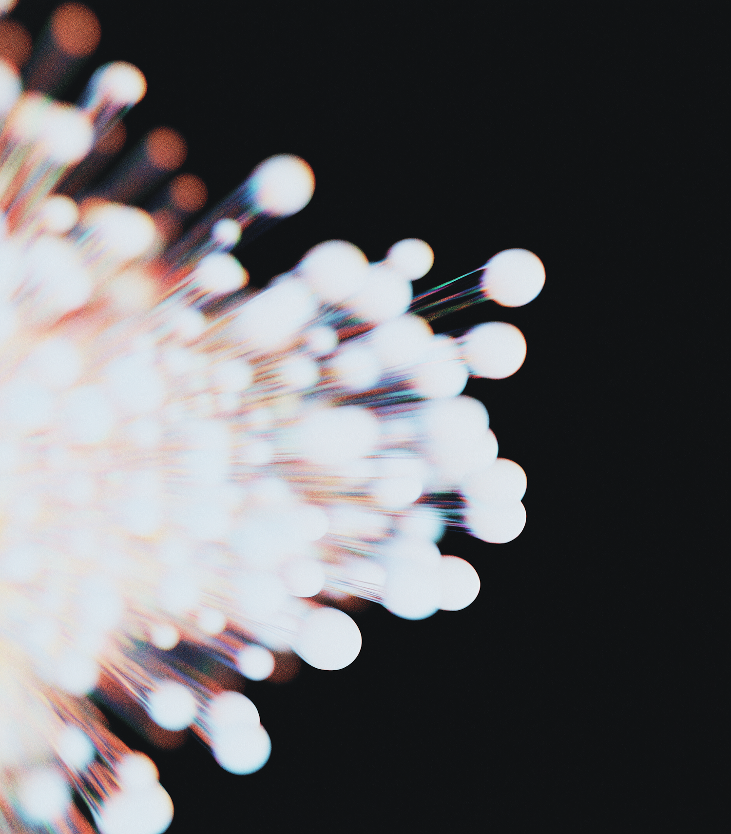 Abstract burst of light with glowing orbs and streaks on a dark background, creating a dynamic and futuristic visual effect.