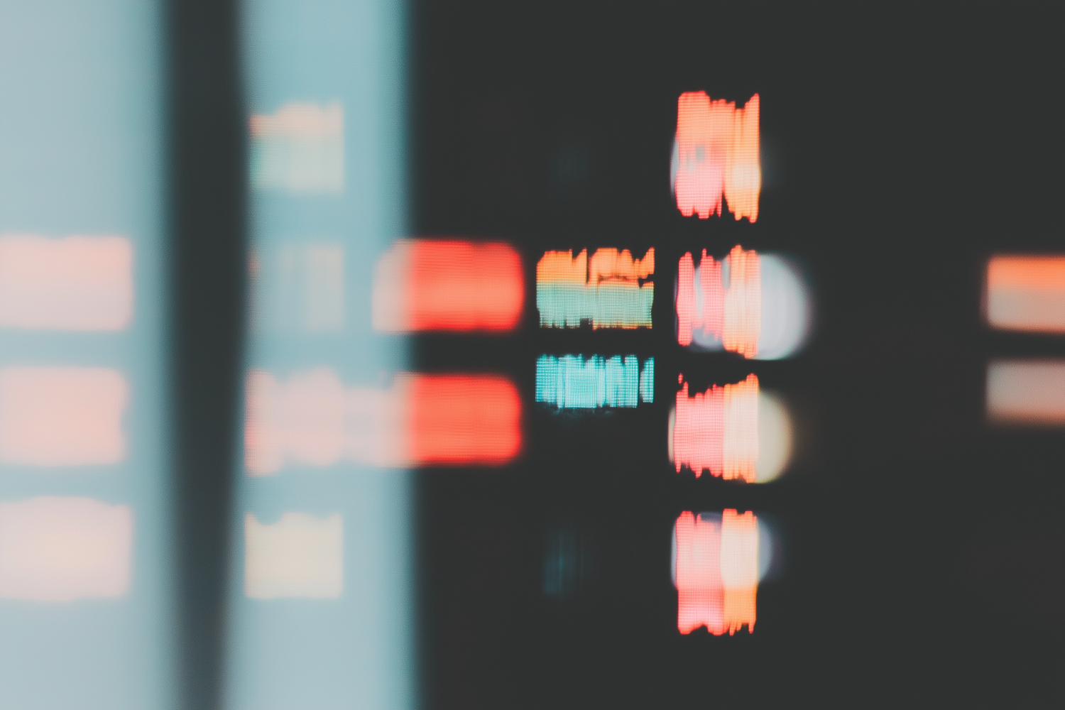 Abstract blurred lights in vibrant red, orange, and blue hues on a dark background, evoking a digital or electronic display.