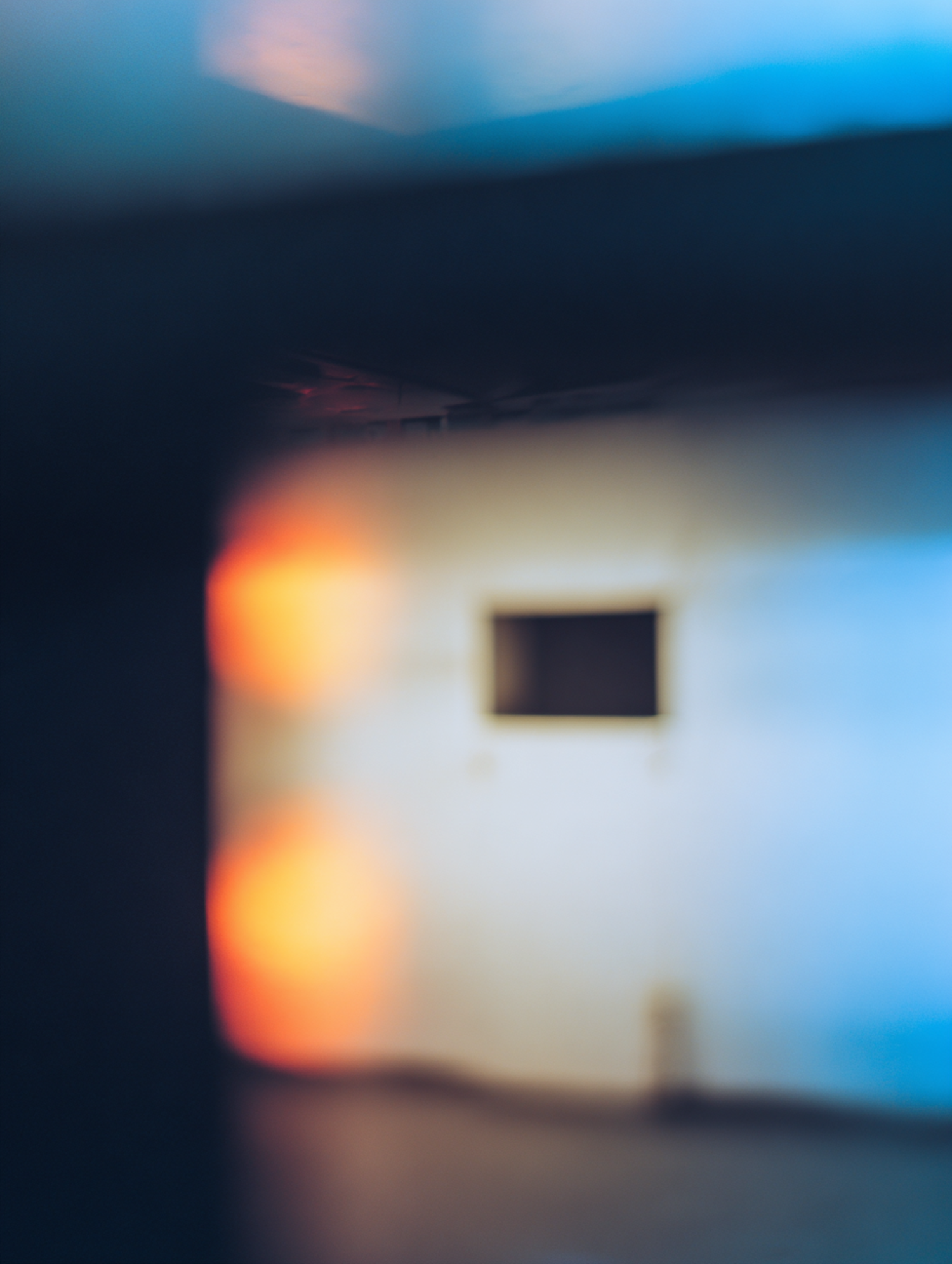 Abstract scene with blurred focus, featuring warm orange and cool blue lighting on a wall with a rectangular opening.