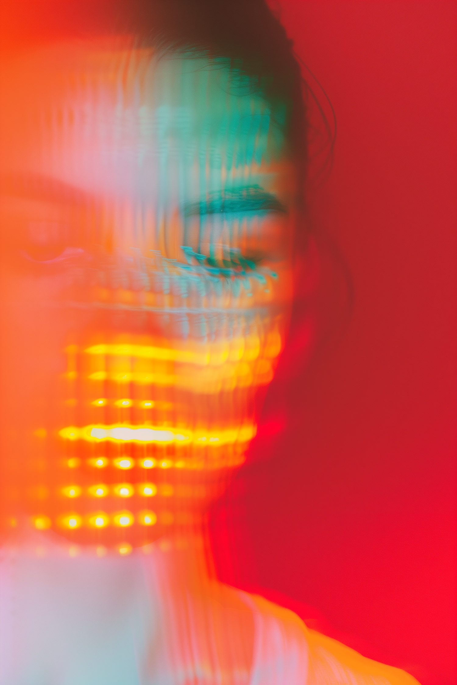 Abstract image of a blurred face with vibrant streaks of yellow, orange, and teal light on a red background, creating a surreal effect.