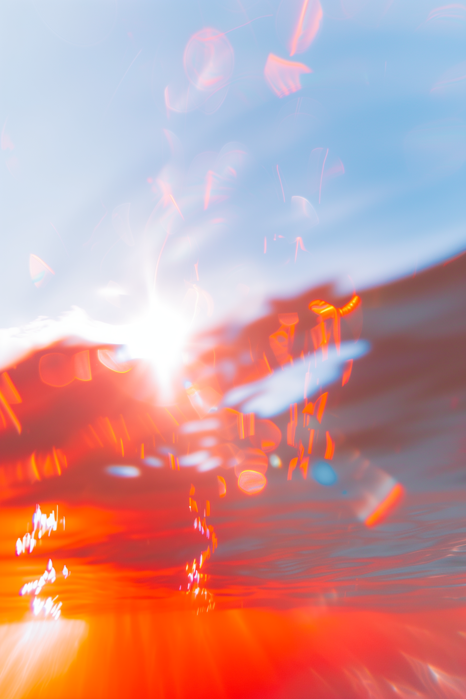Abstract blend of fiery reds and cool blues with light reflections and flares, evoking a dreamy, surreal atmosphere.