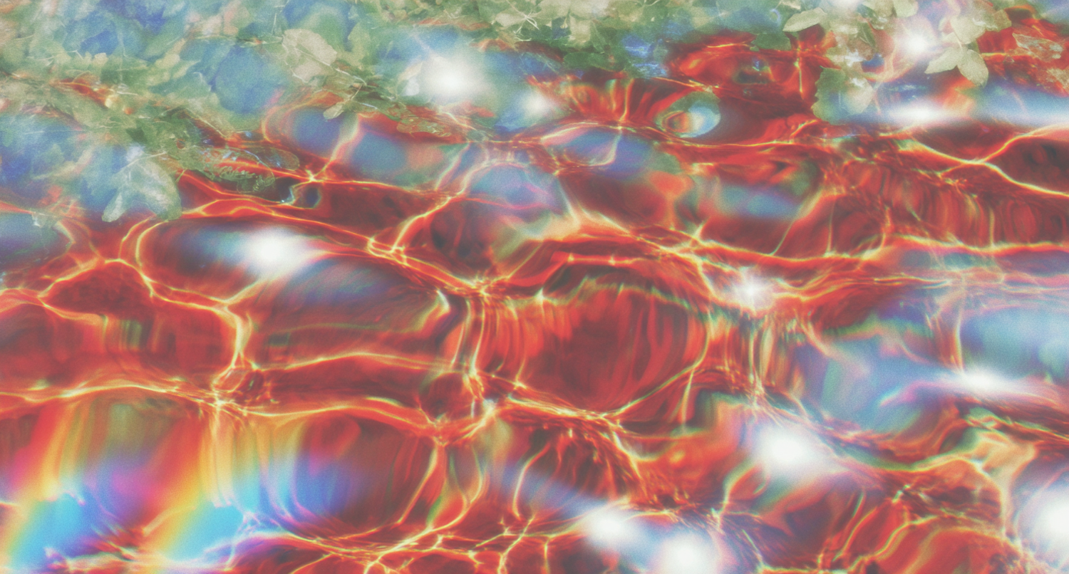 Abstract light refractions in water with vibrant red, orange, and blue hues, contrasted by green foliage above, creating a dreamlike scene.
