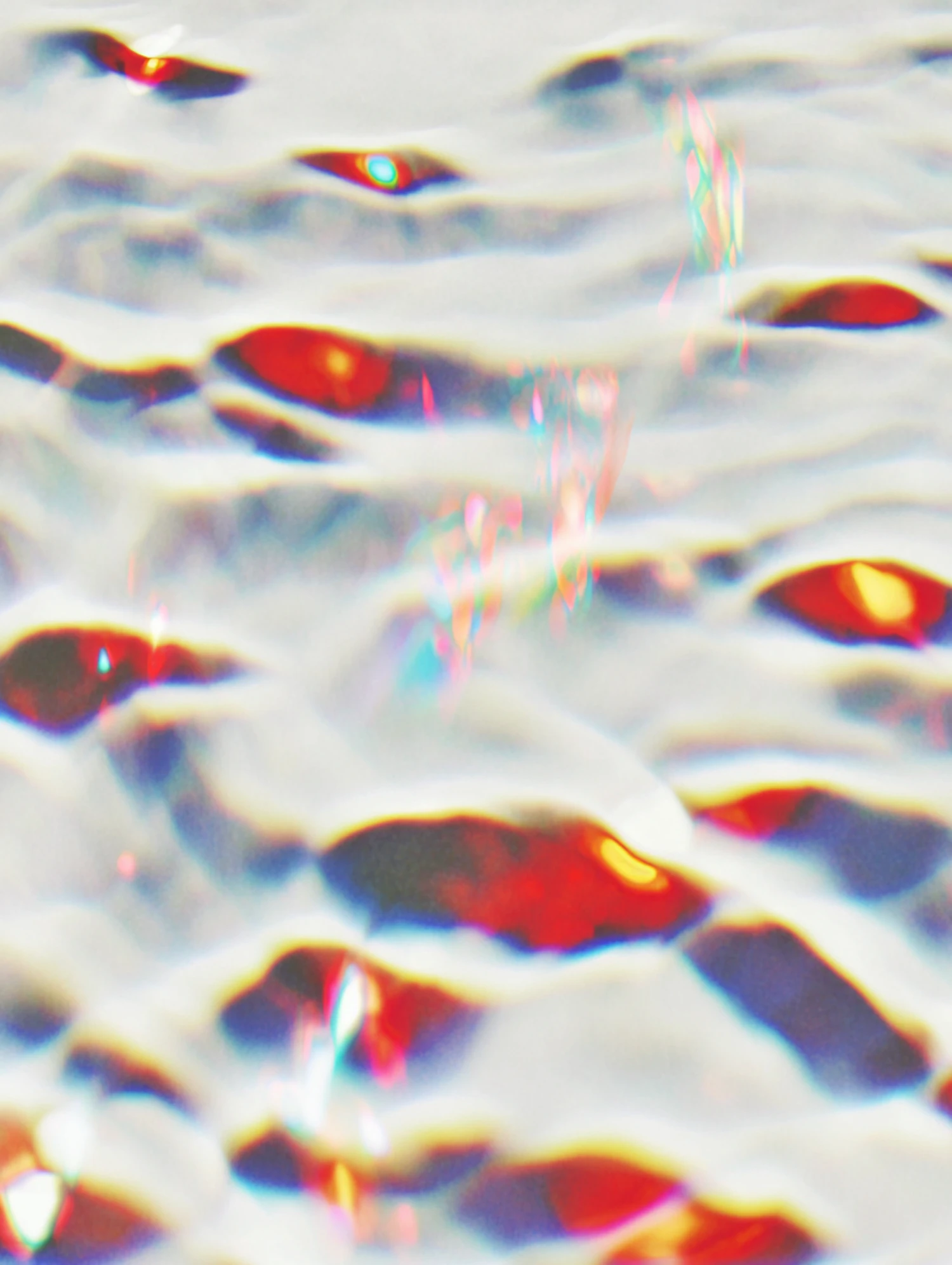 Abstract rippling surface with vibrant red highlights and iridescent reflections, creating a dynamic and colorful visual effect.