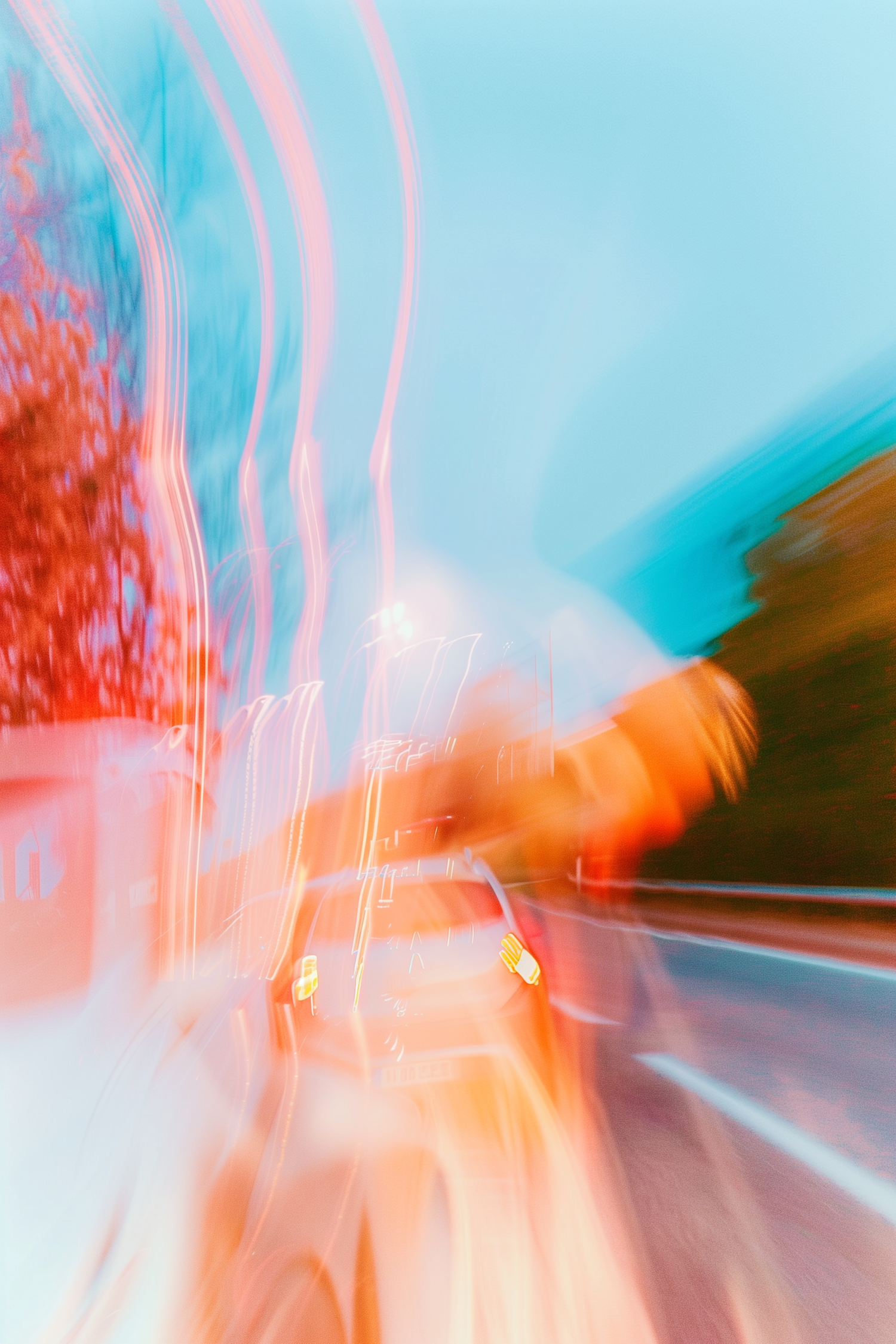 Abstract motion blur with vibrant streaks of light, a car's rear lights, and dynamic blue and orange tones creating a surreal effect.