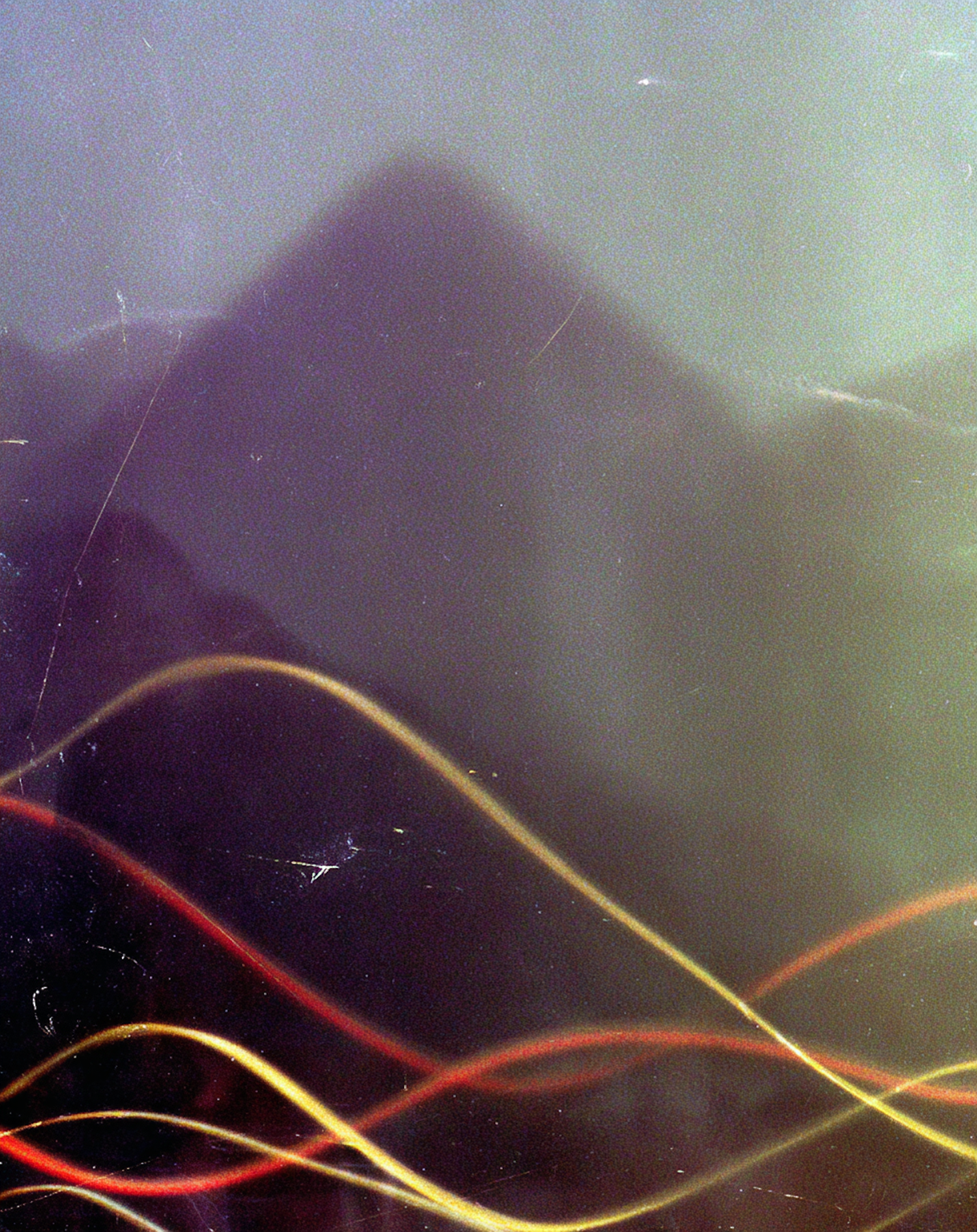 Abstract image with colorful light trails over a hazy, dark background resembling a mountain silhouette, creating a dreamlike effect.