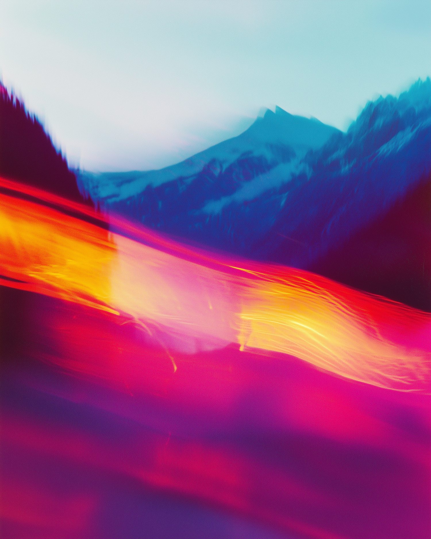 Abstract light trails in vivid red, orange, and yellow streak across a blurred mountain landscape in cool blue tones. Dreamlike and vibrant.