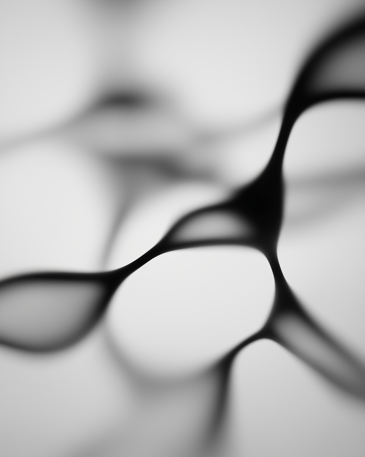 Abstract black interconnected loops on a soft gray background, creating a minimalistic and fluid design with a sense of depth.