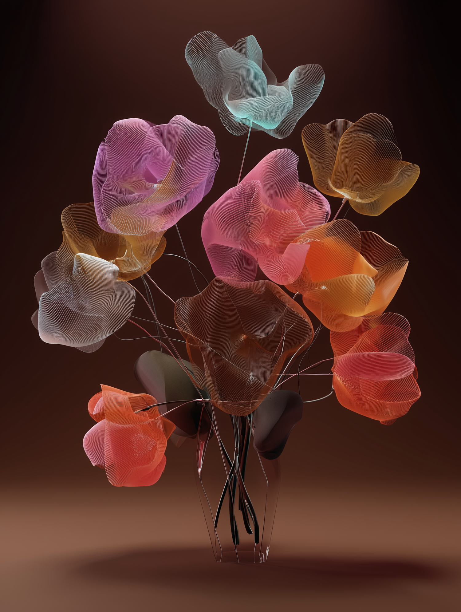 Abstract mesh flowers in vibrant colors arranged in a transparent vase, set against a dark brown gradient background.