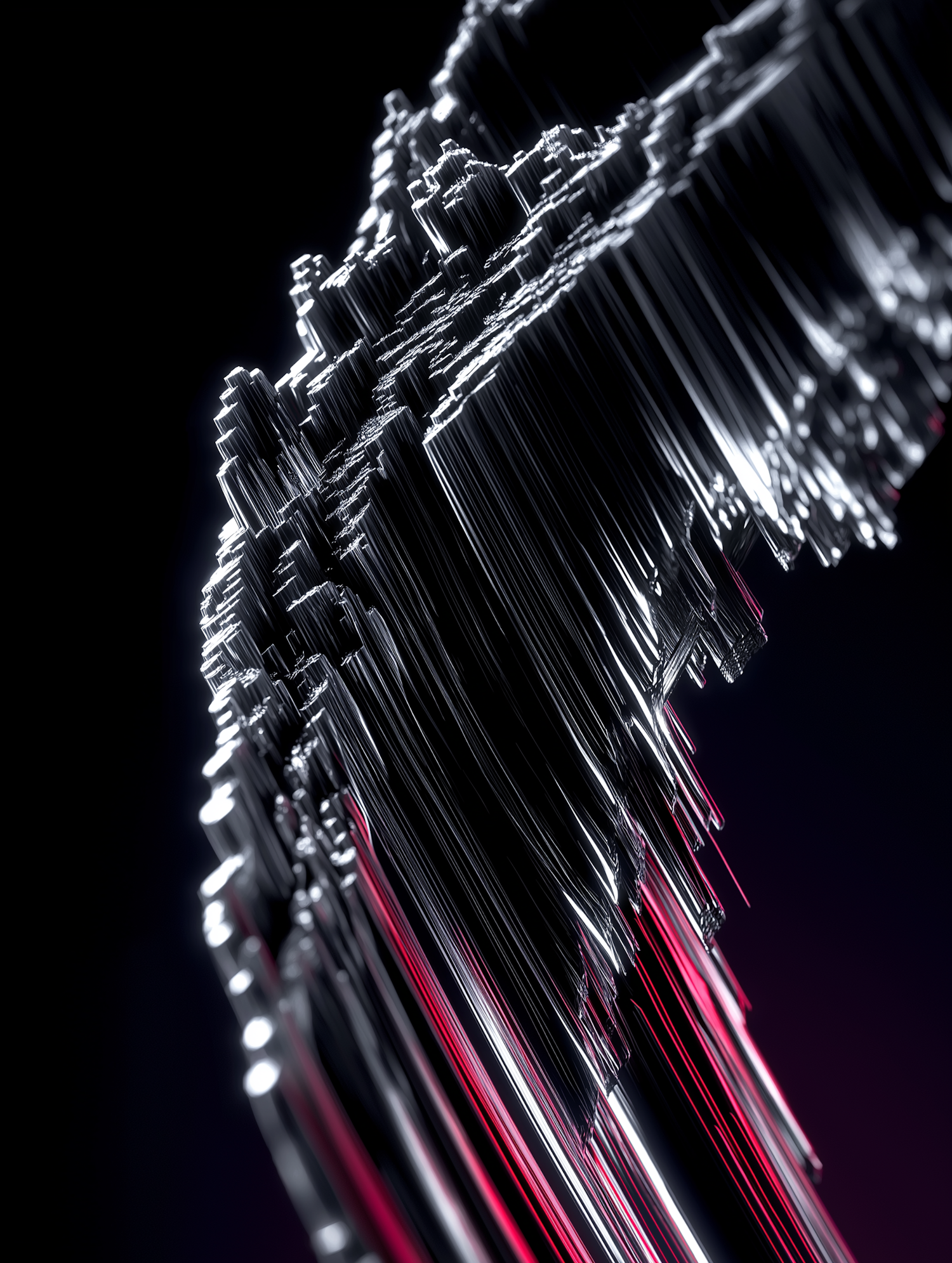 A stunning abstract 3D render featuring intricate metallic structures with vibrant red accents against a dark background.