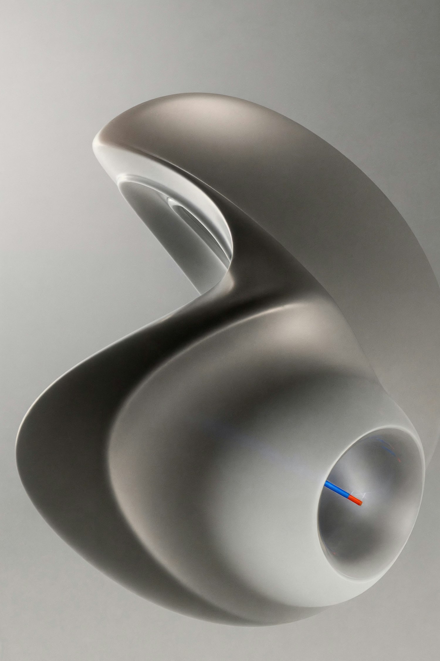 Abstract metallic sculpture with smooth curves and a hollow center, featuring a small colorful detail inside, set against a gray background.