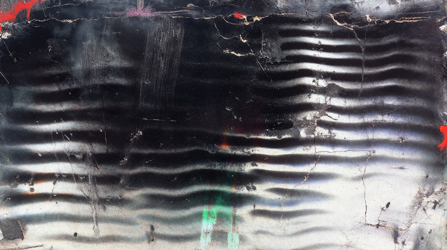 Abstract metallic texture with wavy ripples, cracks, and weathered details. Subtle black, gray, and white tones with red and green accents.