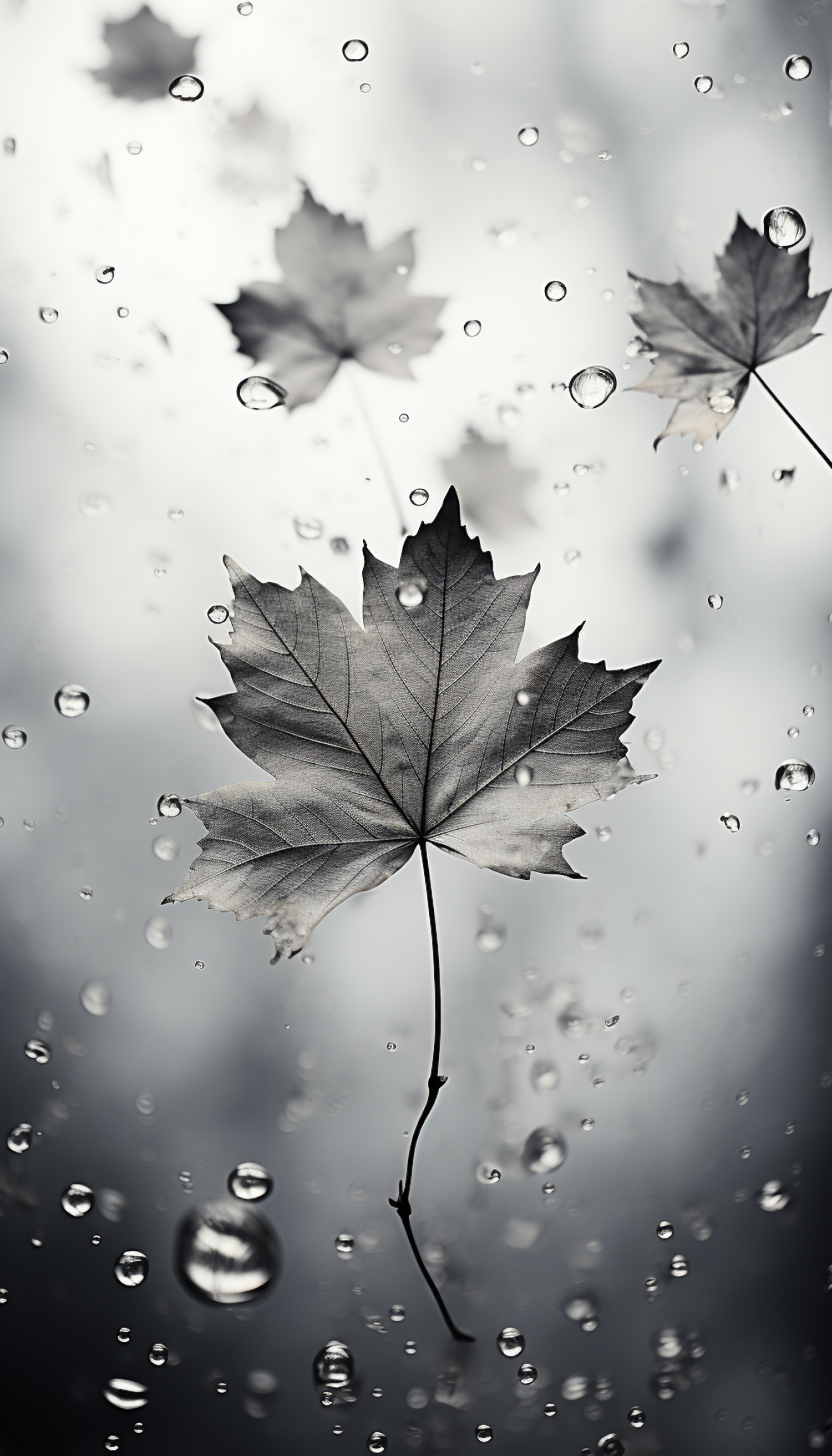 Monochrome maple leaf with raindrops, creating a serene and ethereal atmosphere with fluid motion and delicate textures.