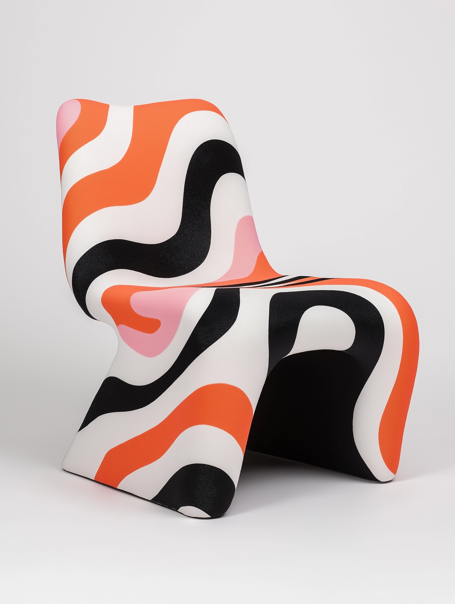 Bold modern chair with wavy orange, black, white, and pink patterns on a seamless curvy structure, perfect for contemporary interiors.