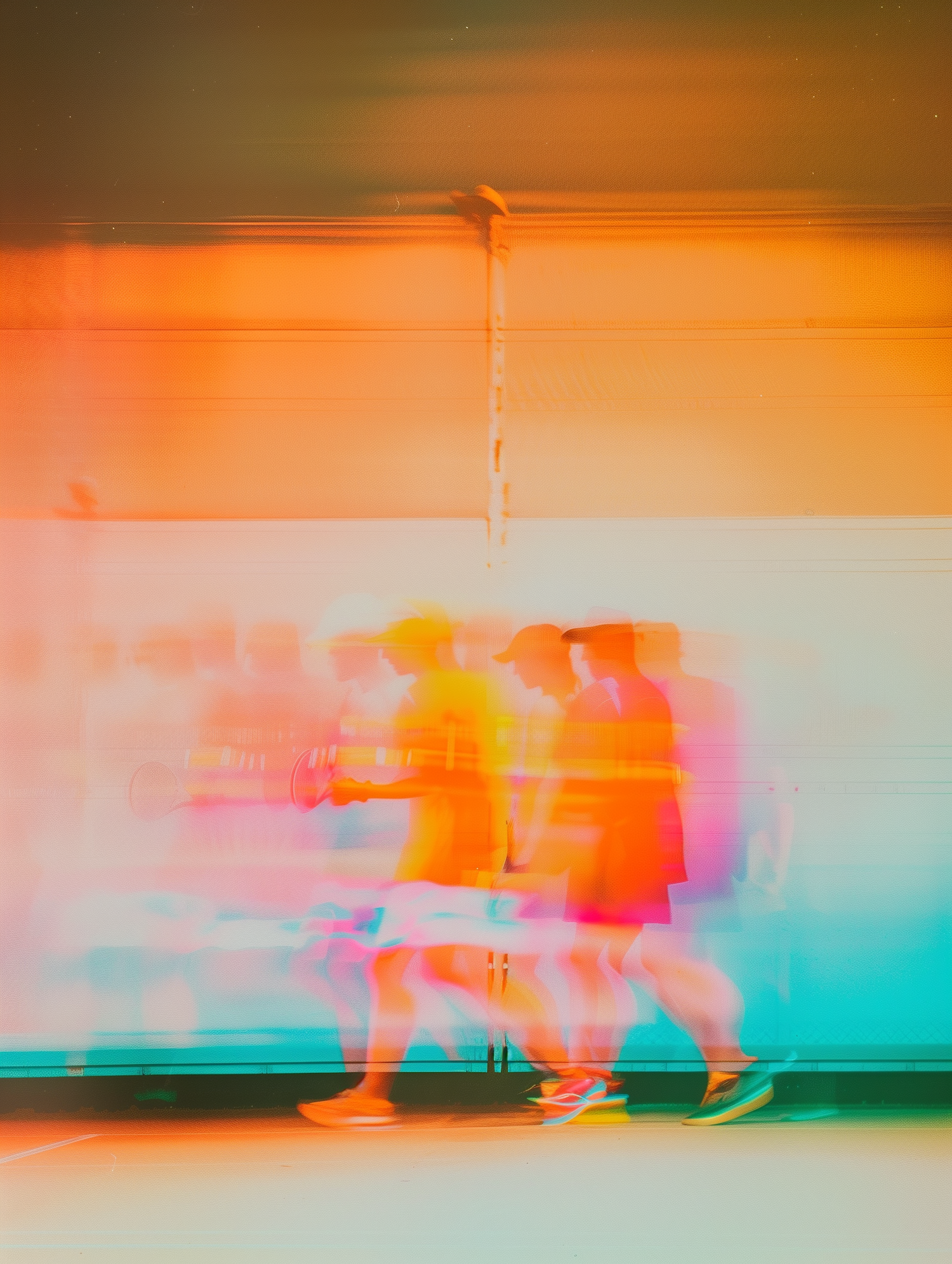Abstract motion blur of two people walking with rackets, layered in neon colors like orange, pink, and teal, creating a surreal sports vibe.