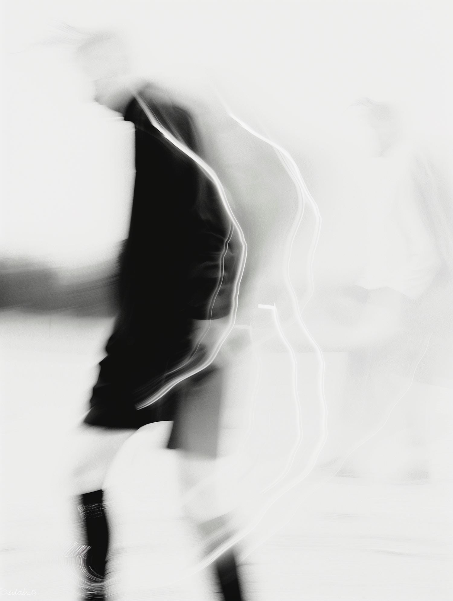 Abstract black-and-white image of a person in motion, with light streaks and motion blur creating a ghostly, dreamlike effect.