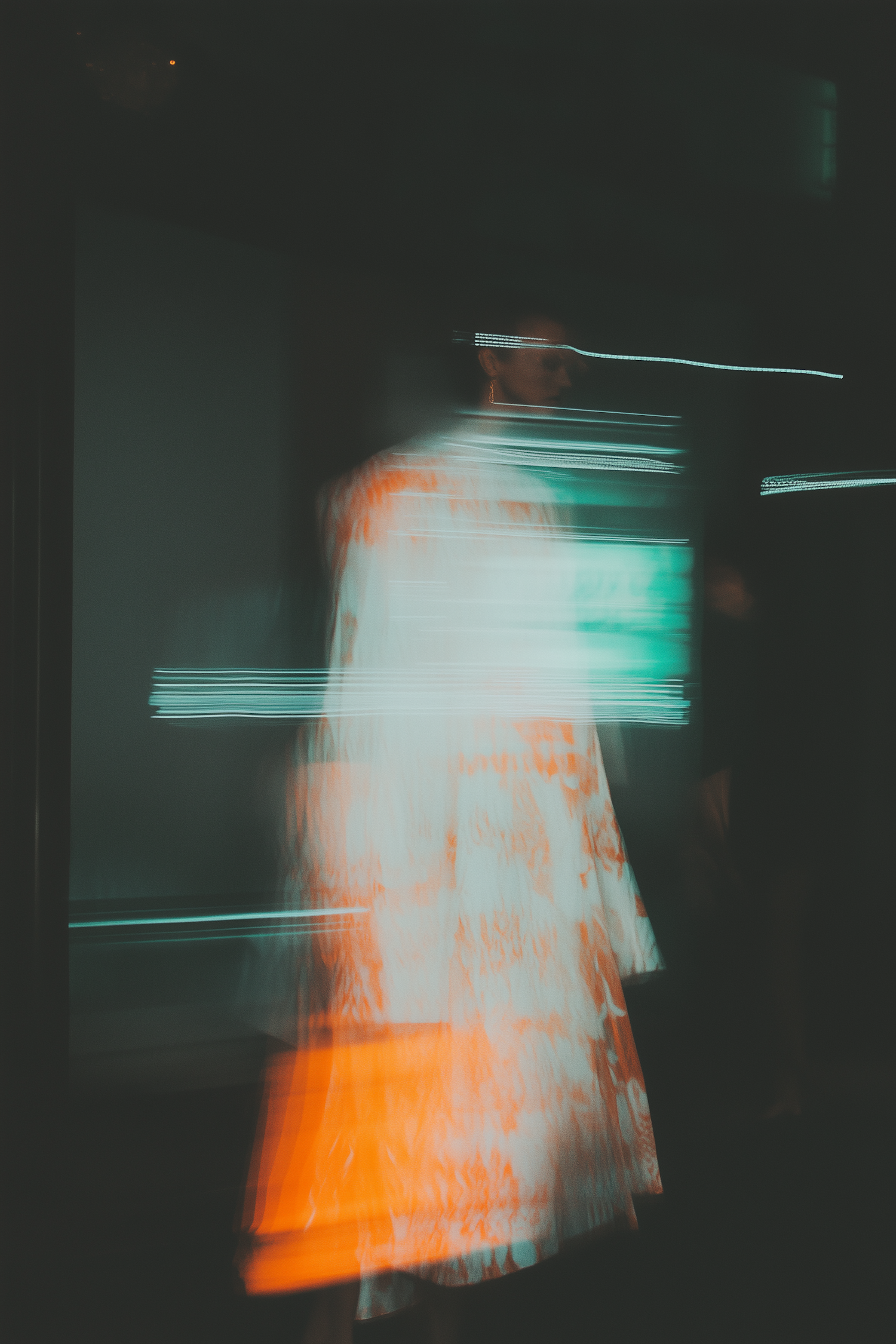 Abstract motion blur of a person in a white and orange outfit with streaks of light in a dark setting, creating a dynamic and artistic effect.