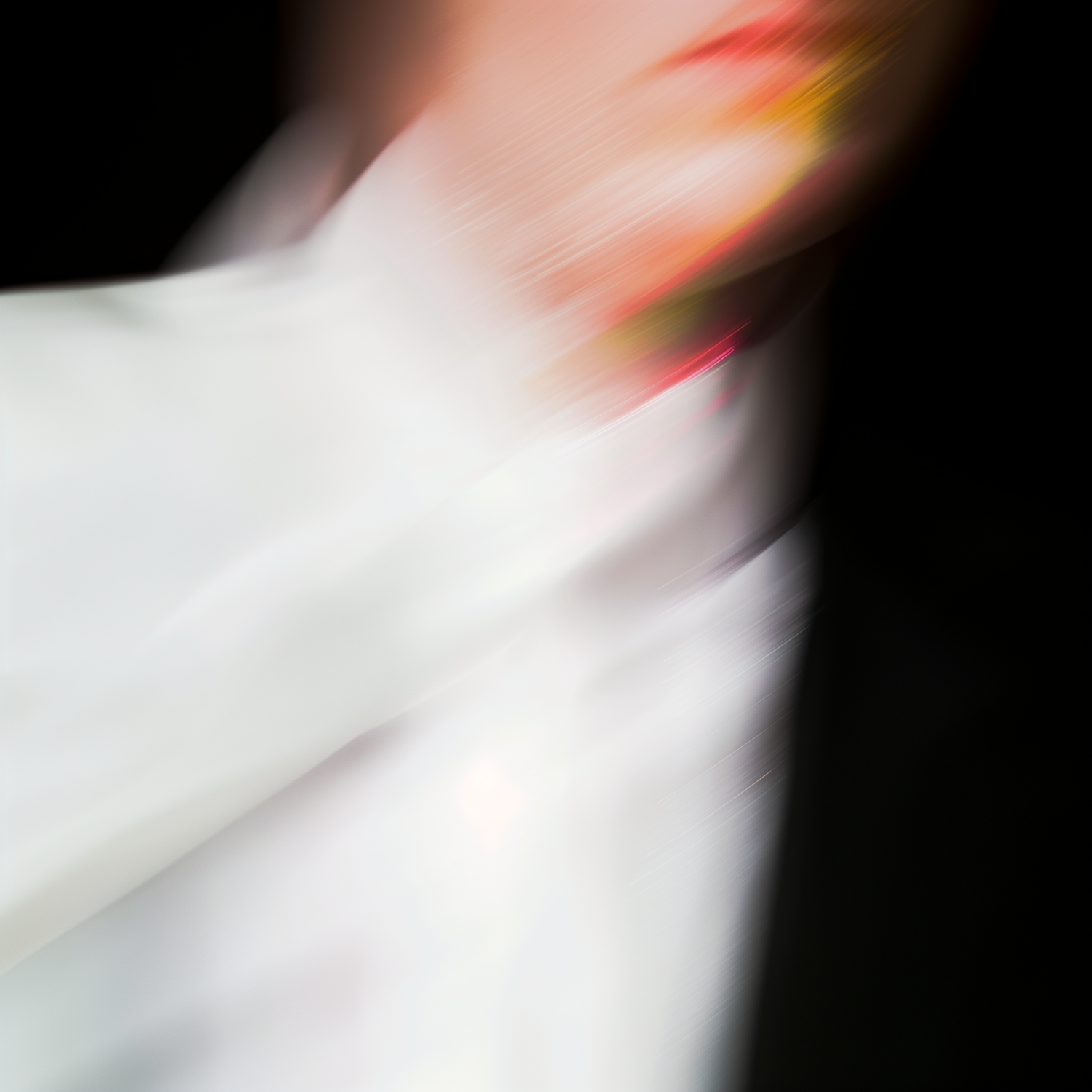 Abstract blurred image of a person in a white shirt and black jacket with streaks of red and yellow, creating a dynamic, artistic effect.