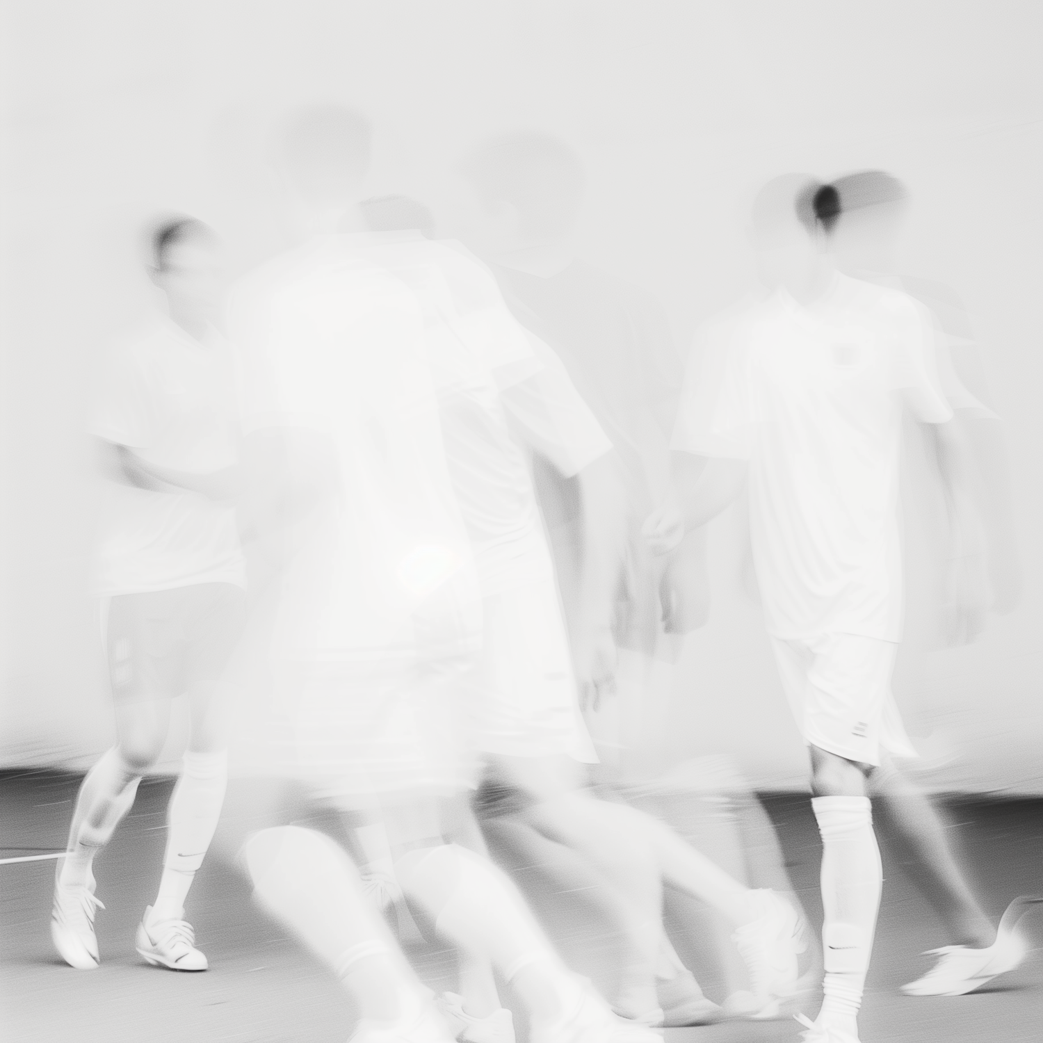 Abstract black-and-white image of blurred figures in motion, wearing athletic clothing, creating a ghostly and dynamic visual effect.