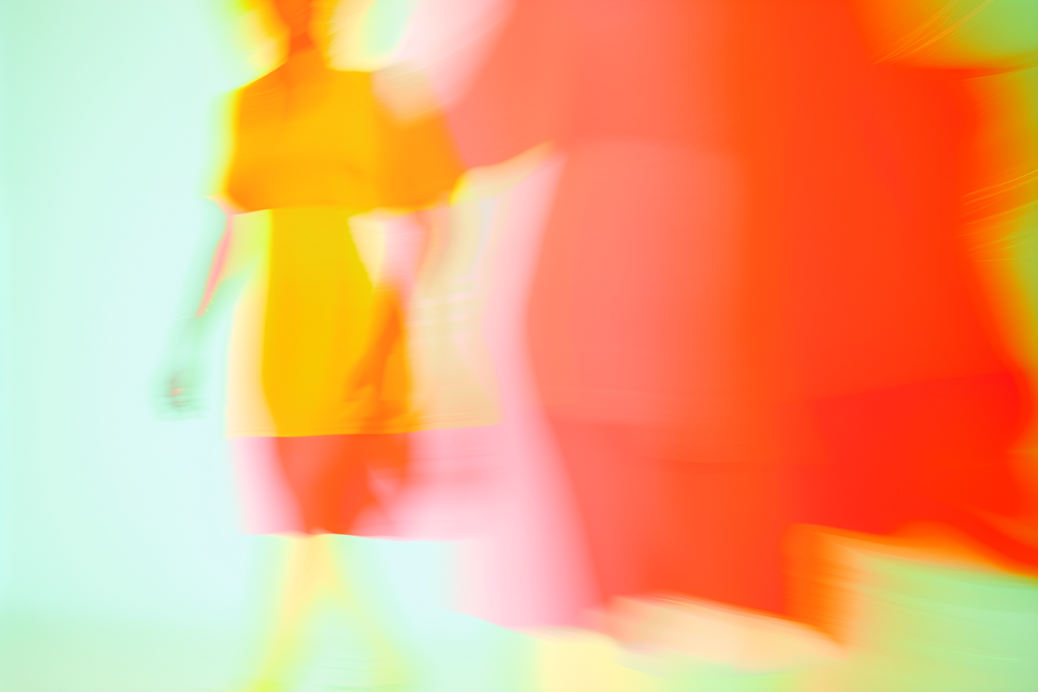 Abstract image with blurred human-like forms in vibrant yellow, orange, and red tones, creating a dynamic and dreamy visual effect.