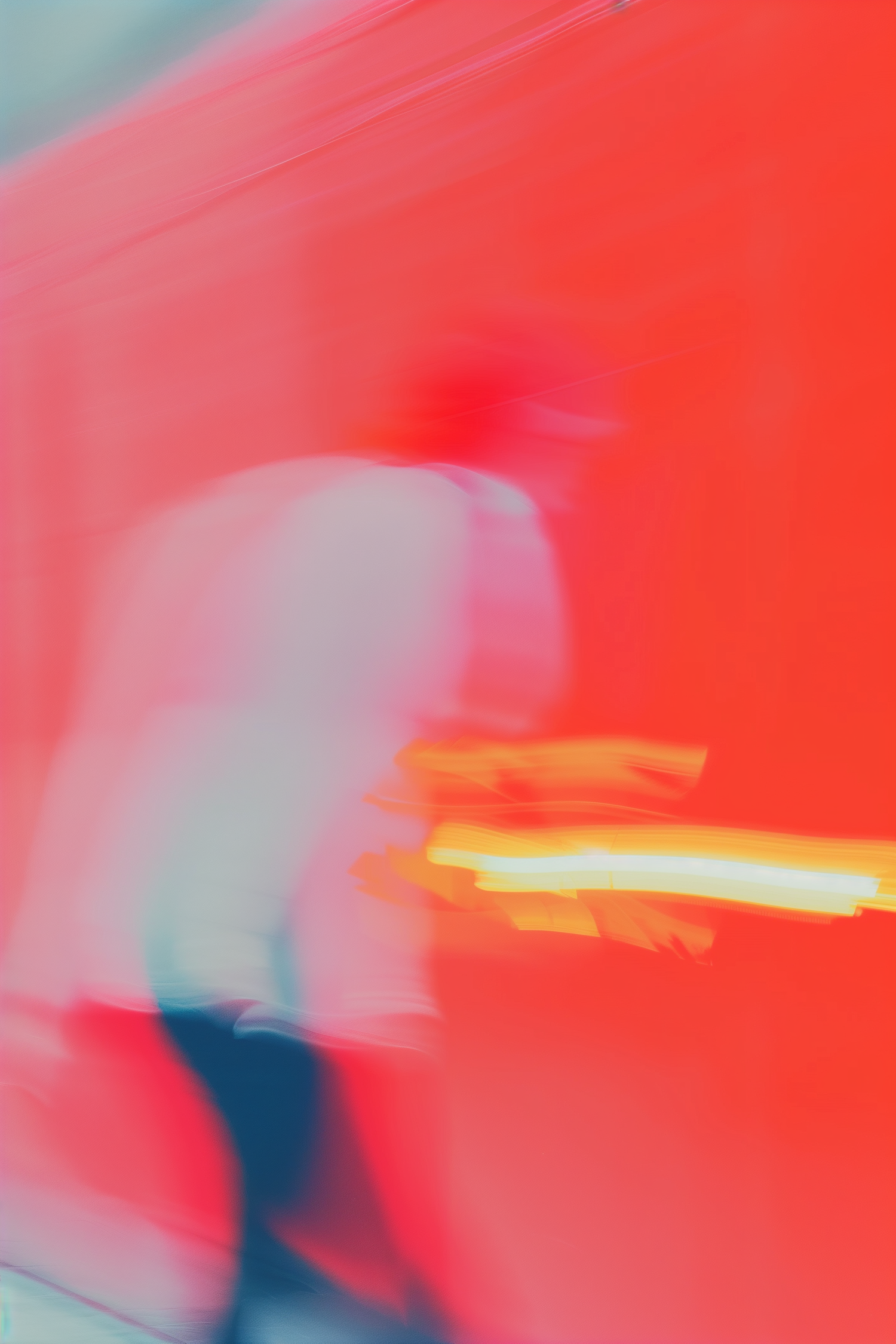 Abstract image with vibrant red tones, blurred figure, and dynamic yellow light streaks, creating a sense of motion and energy.