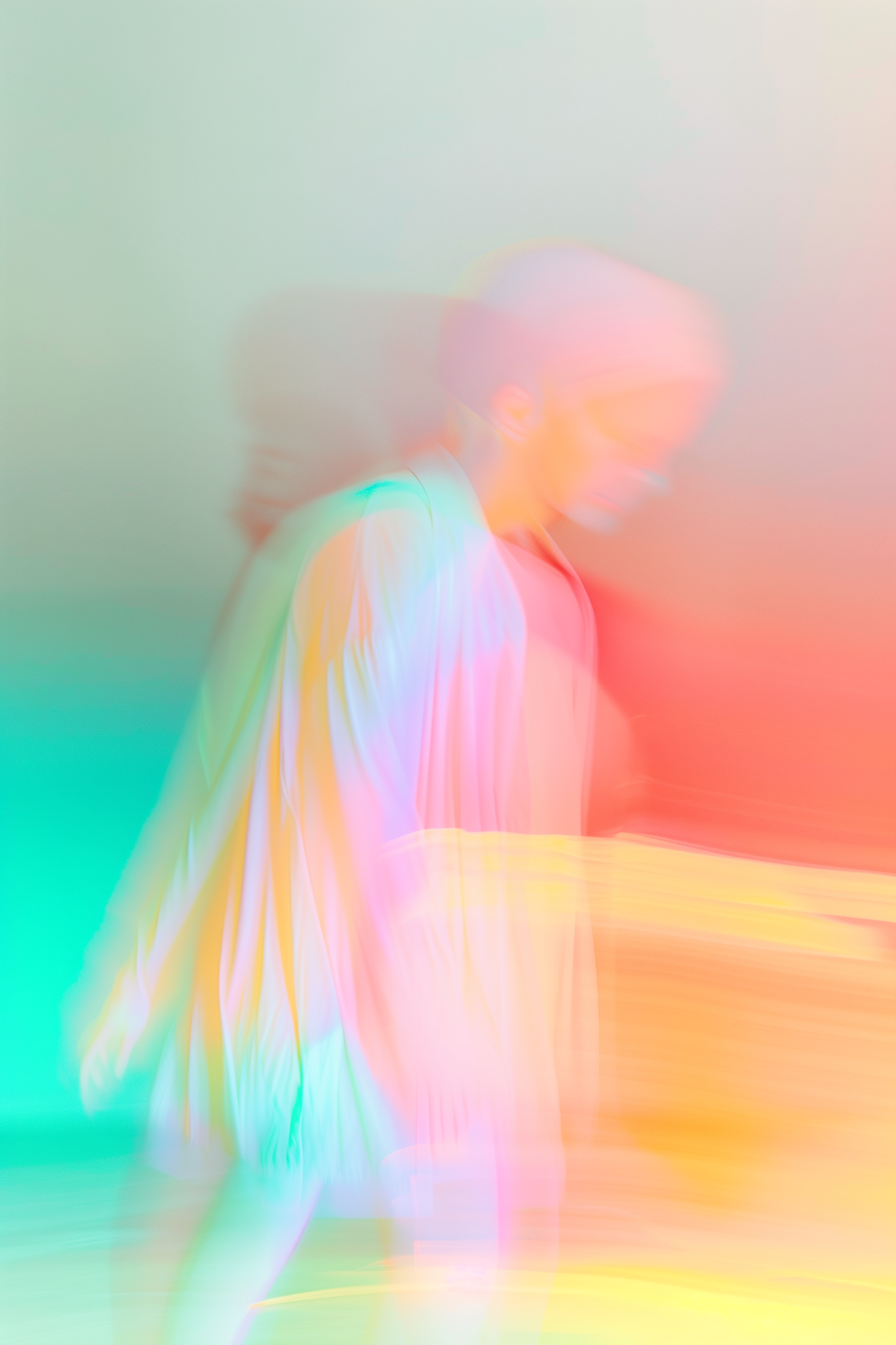 Abstract image of a blurred figure in motion surrounded by vibrant pastel and neon colors, creating a dreamy and surreal effect.