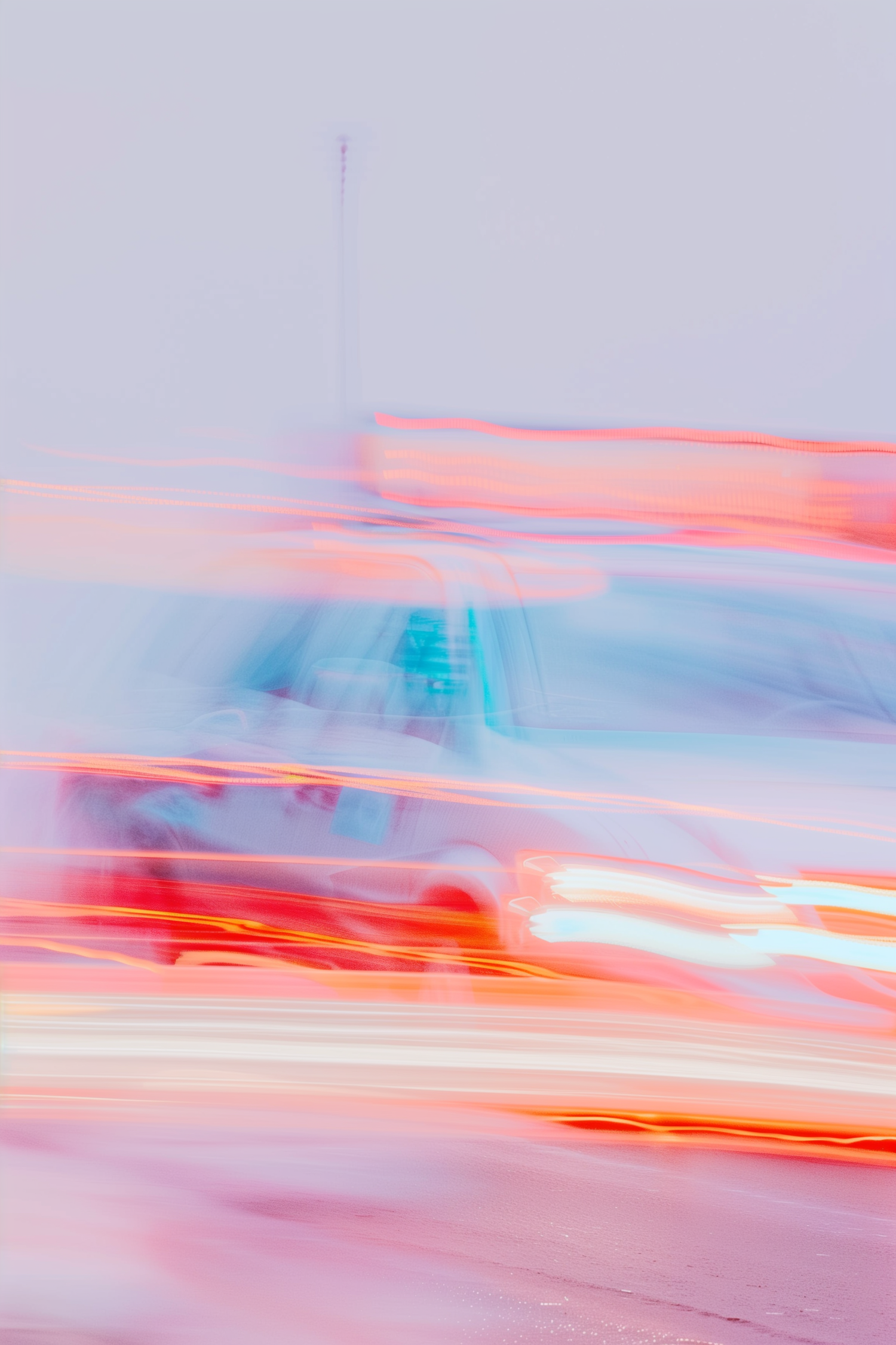 Abstract motion blur of a car with vibrant red and orange light streaks against a muted gray background, creating a dynamic, surreal effect.