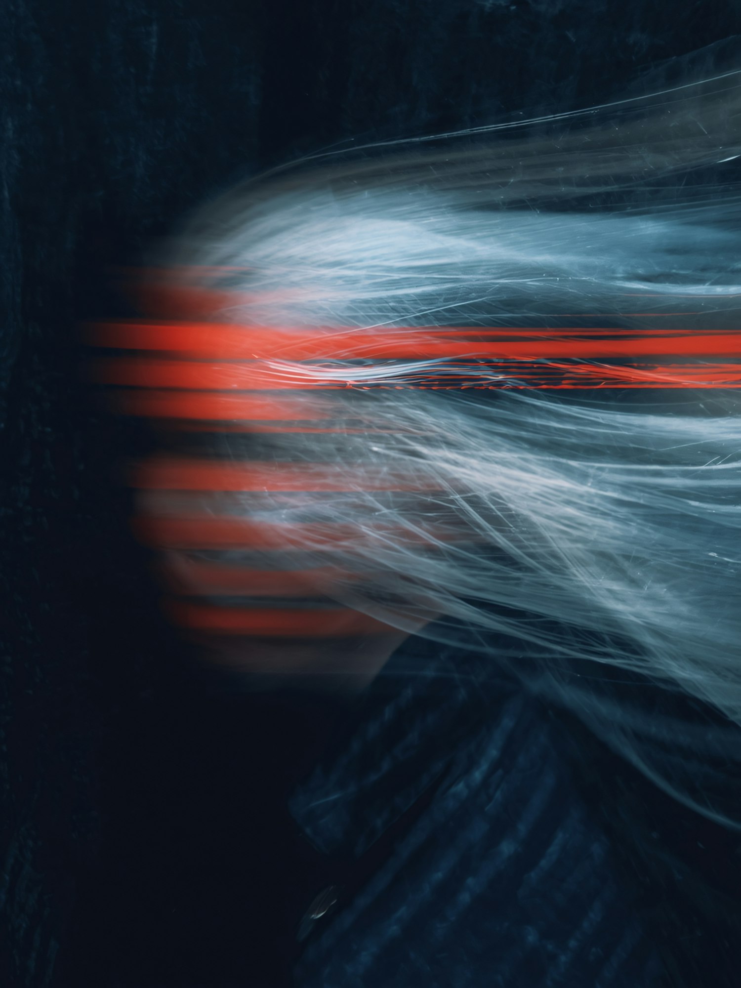 Abstract motion blur of white hair with red streaks on a dark background, creating a dynamic and artistic visual effect.