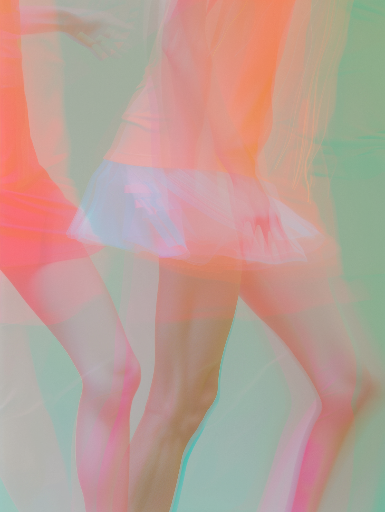 Abstract motion blur of a person in vibrant colors, focusing on legs and movement. Dreamy blend of pink, orange, green, and blue hues.