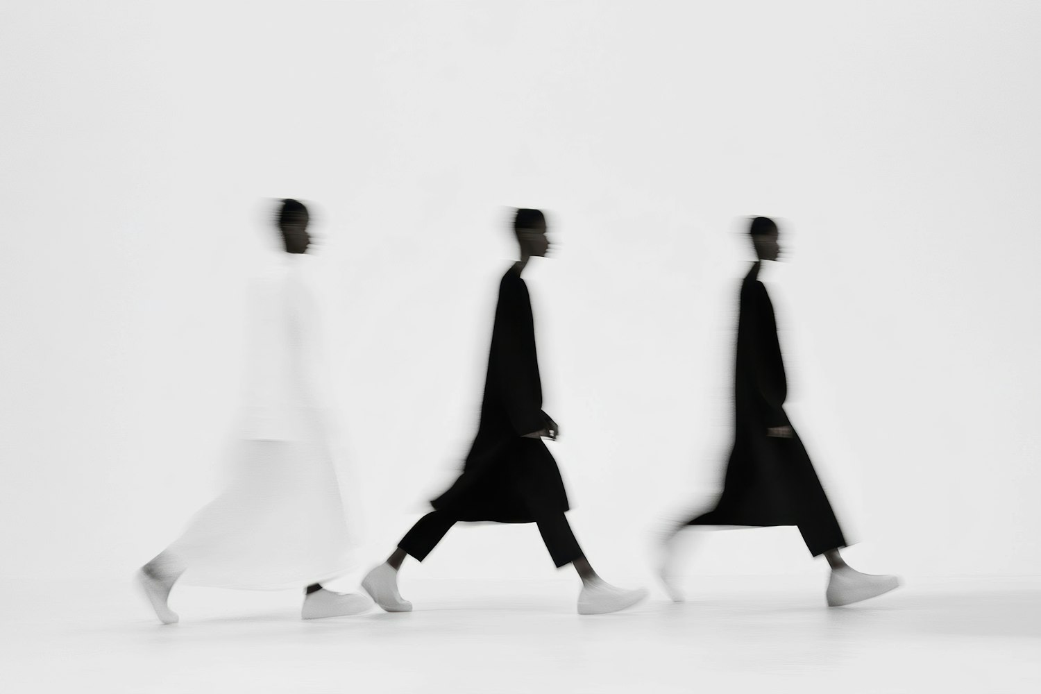 Minimalist motion blur of three figures walking in black and white outfits, set against a stark white background.