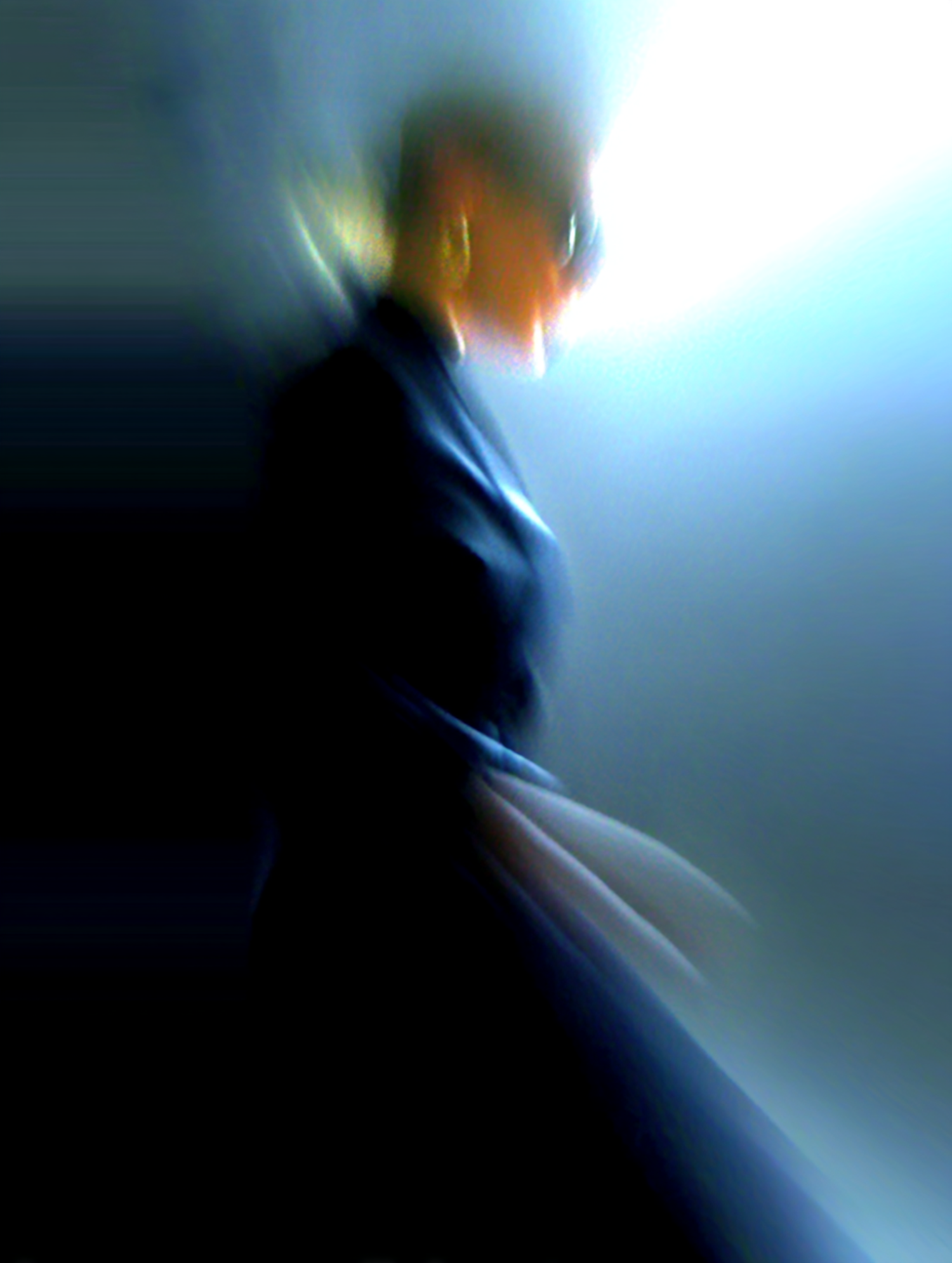 Abstract image of a person in motion with dramatic lighting, wearing sunglasses and gold earrings, against a dark background.