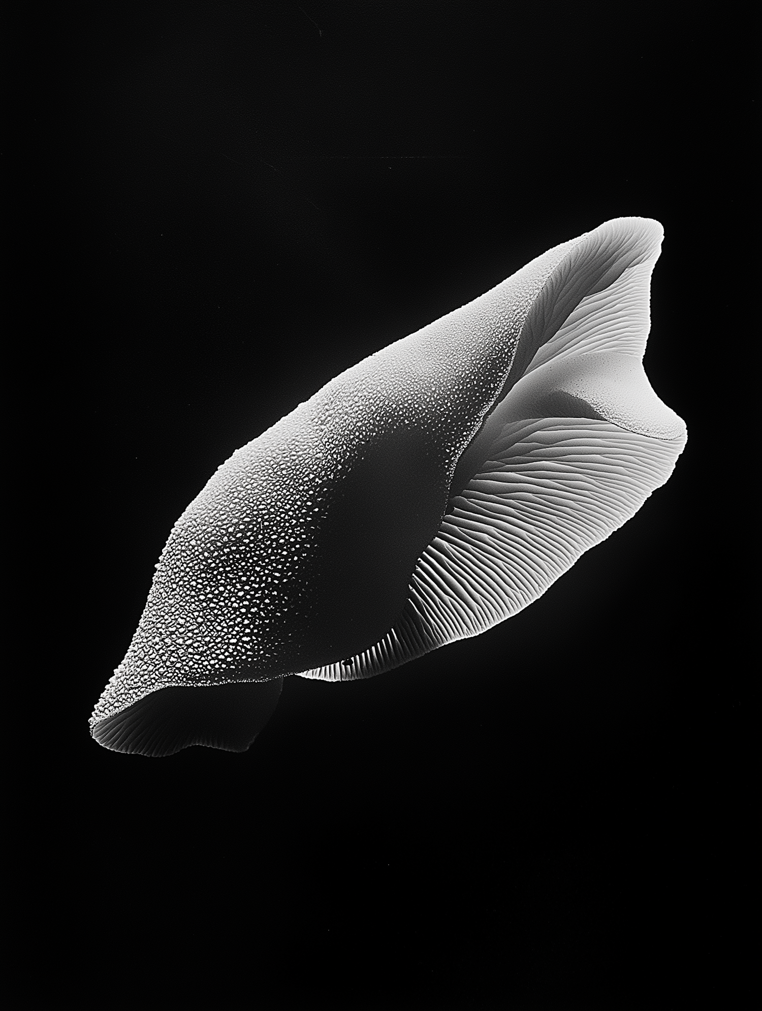 Abstract organic form with textured surface and flowing ridges, floating against a black background. Minimalist and ethereal design.
