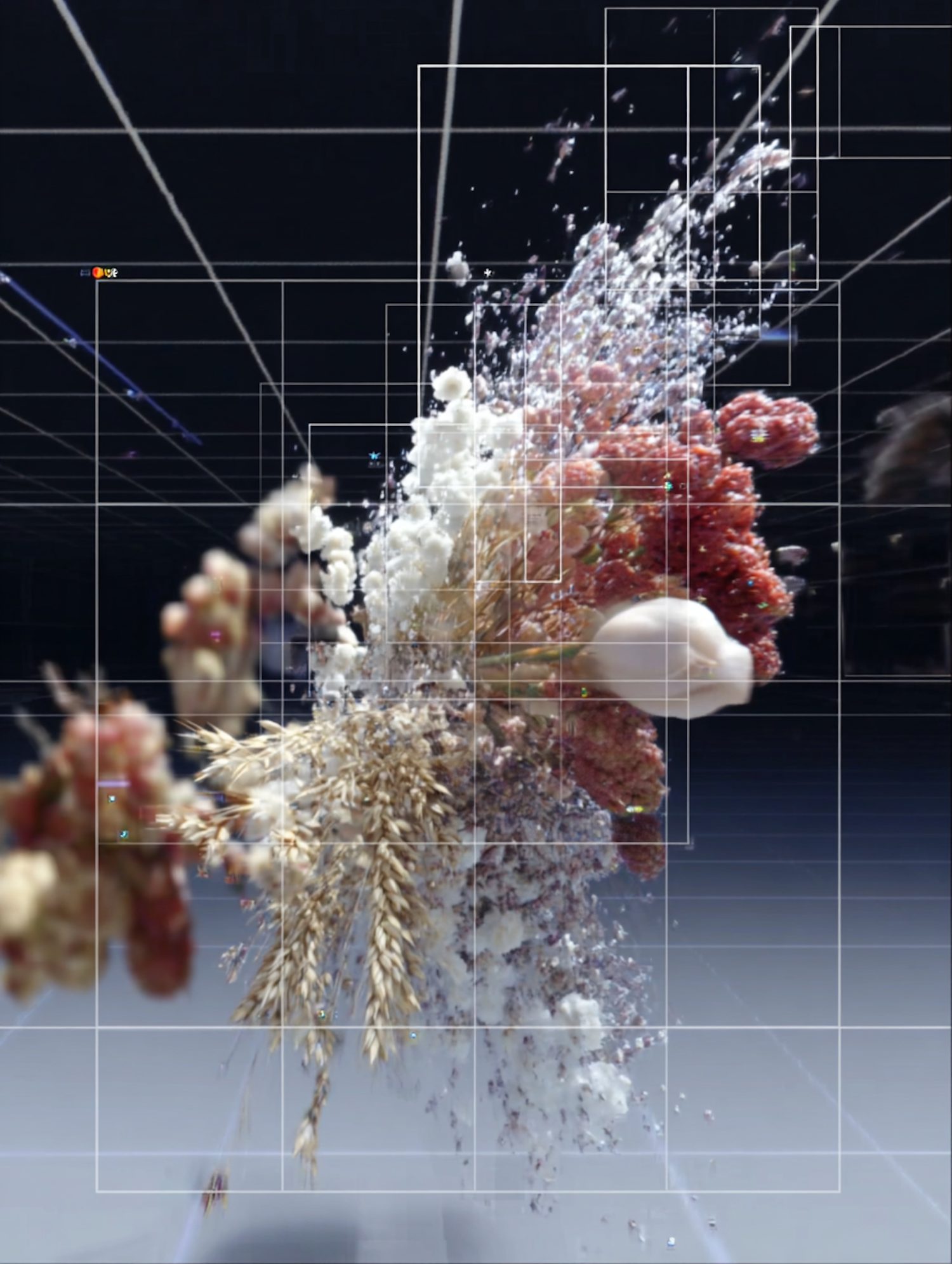 A dynamic 3D composition of organic and abstract elements in motion, set against a futuristic grid background.