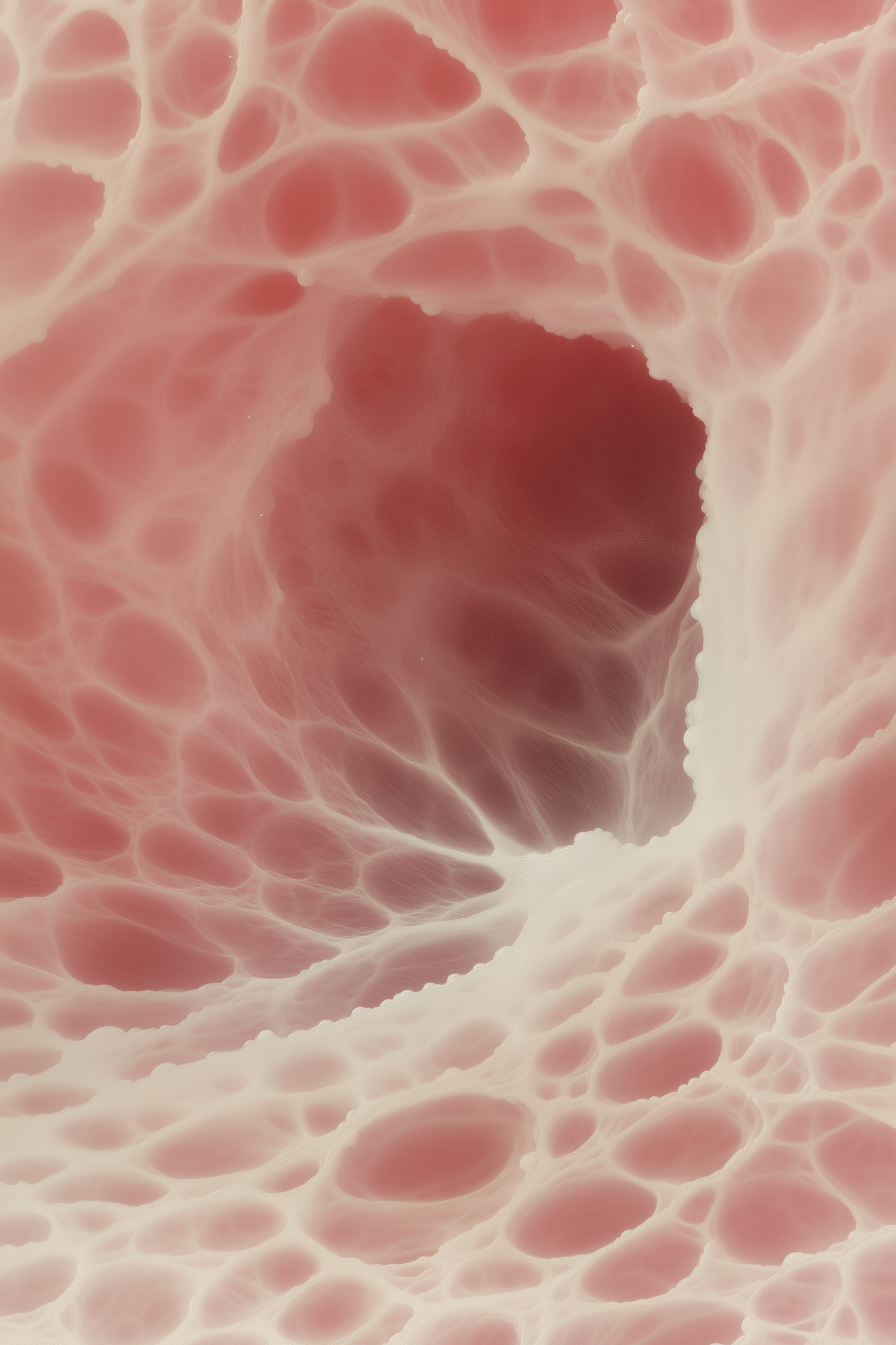 Close-up of a porous, organic structure with pink hues, resembling a microscopic view of biological tissue or sponge.