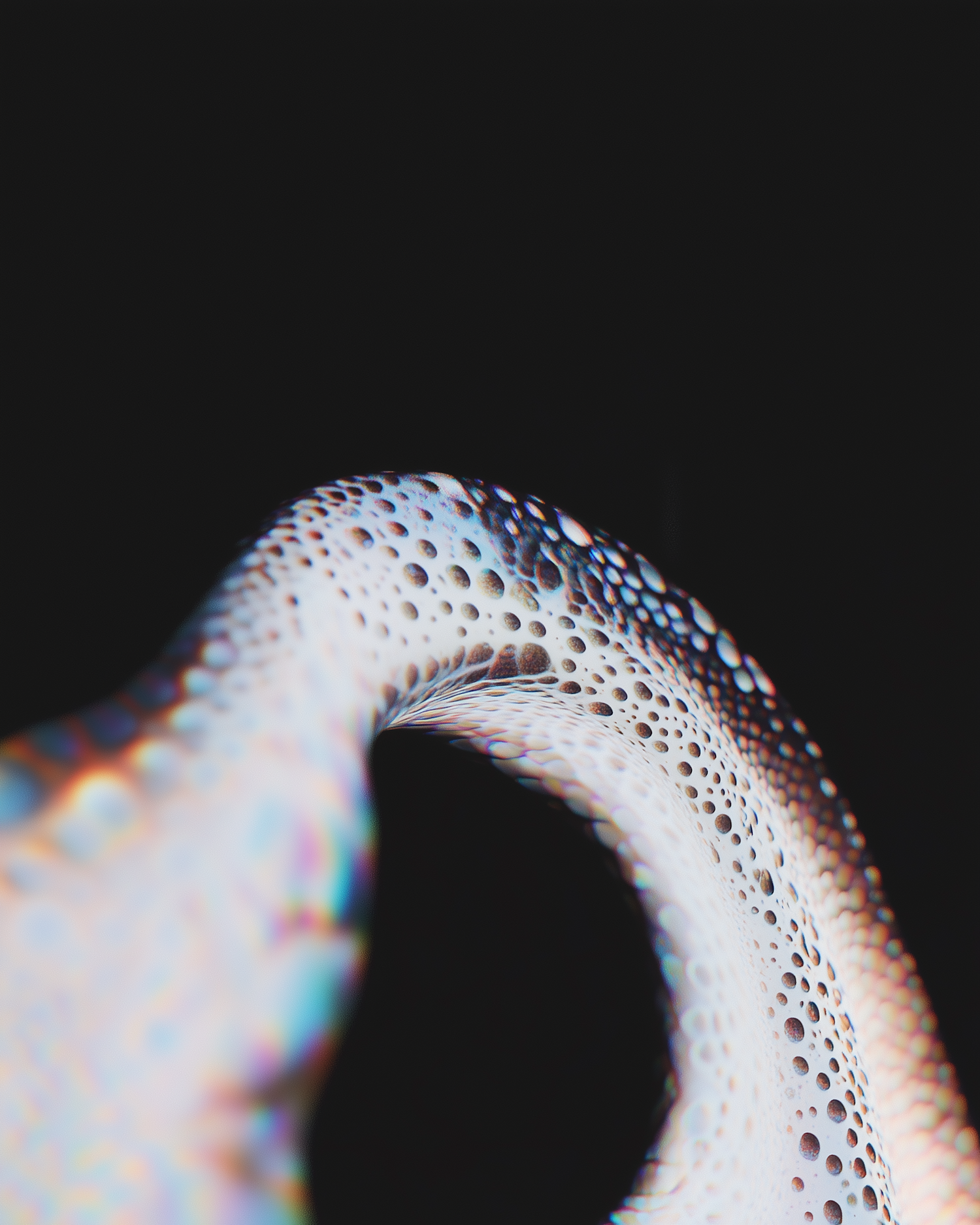 Abstract close-up of a textured, curved object with iridescent reflections against a dark background.