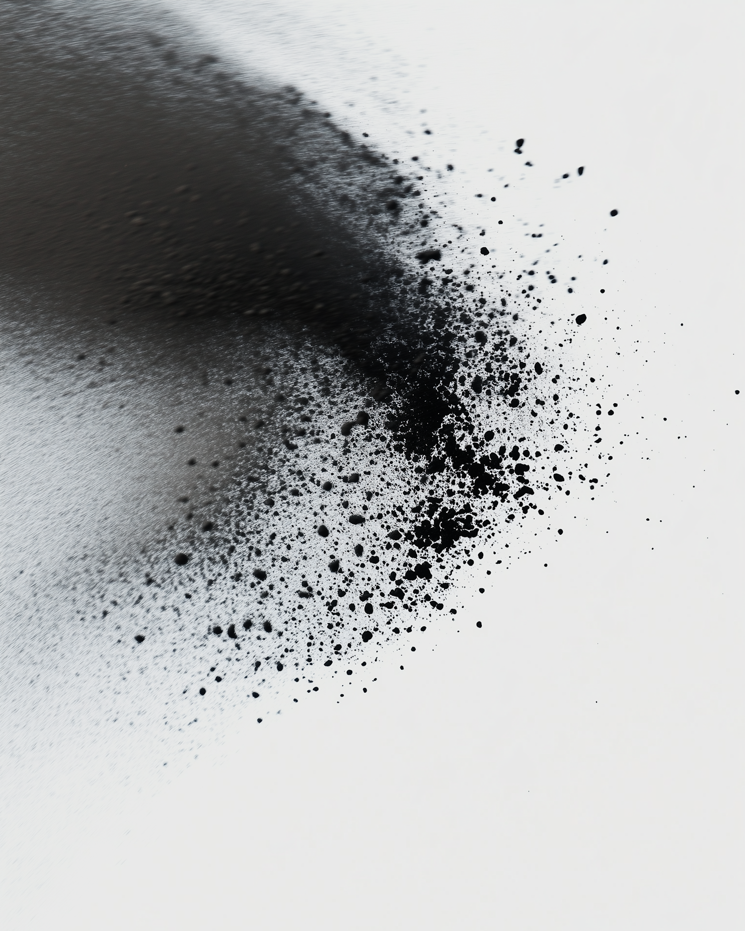 Abstract burst of black particles on a white background, creating a dynamic and minimalist visual with a gradient dispersive effect.