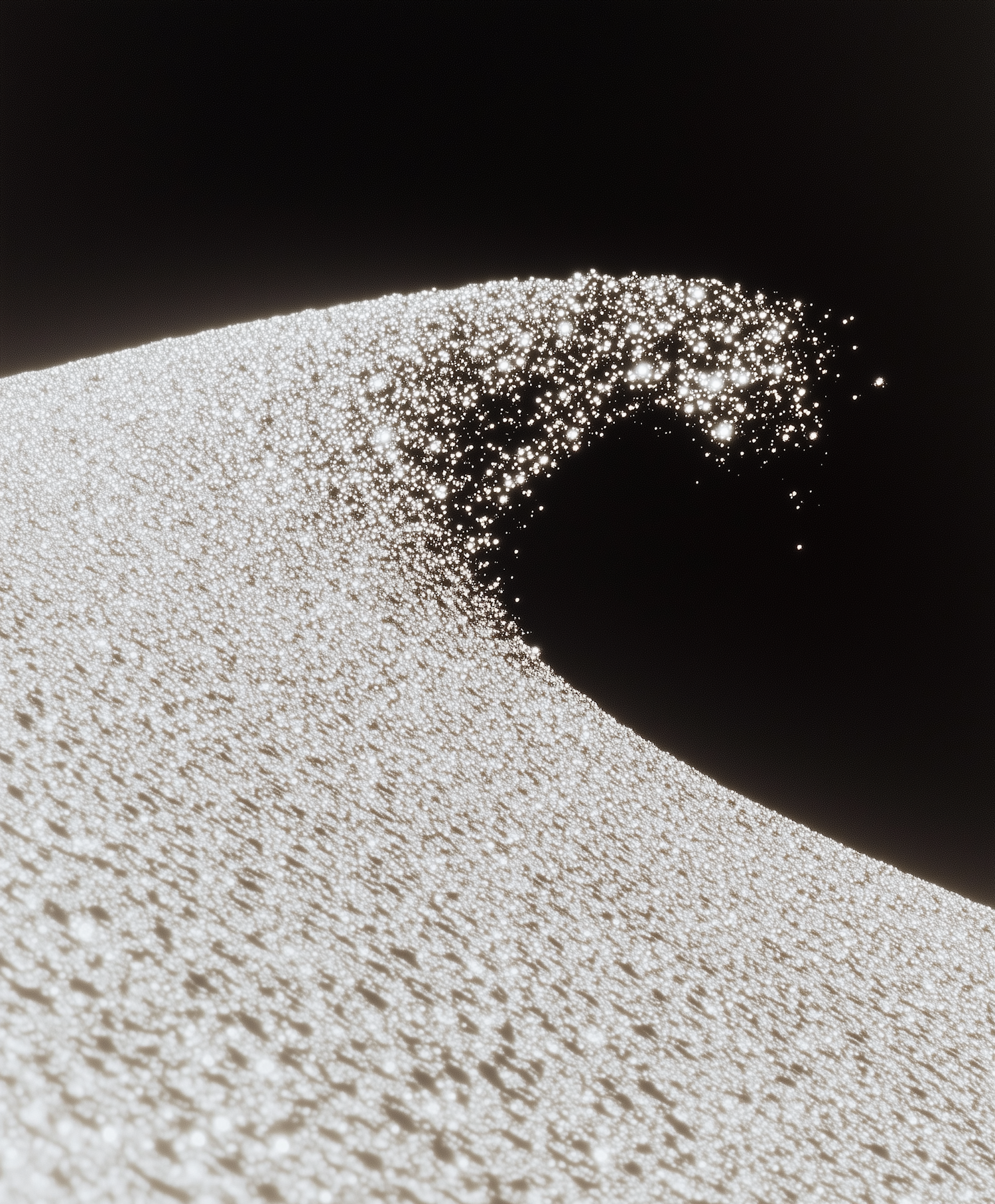 Abstract wave of sparkling particles against a dark background, creating a surreal and dynamic visual effect.
