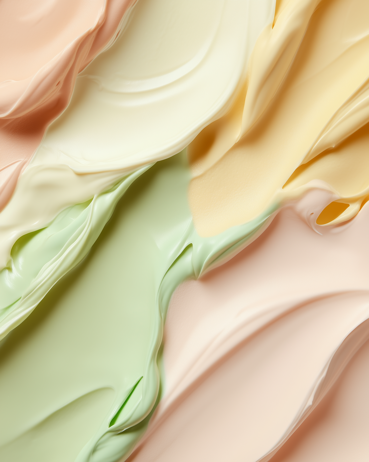 Smooth pastel textures in peach, green, yellow, and cream create a soothing, luxurious visual effect with glossy, creamy surfaces.