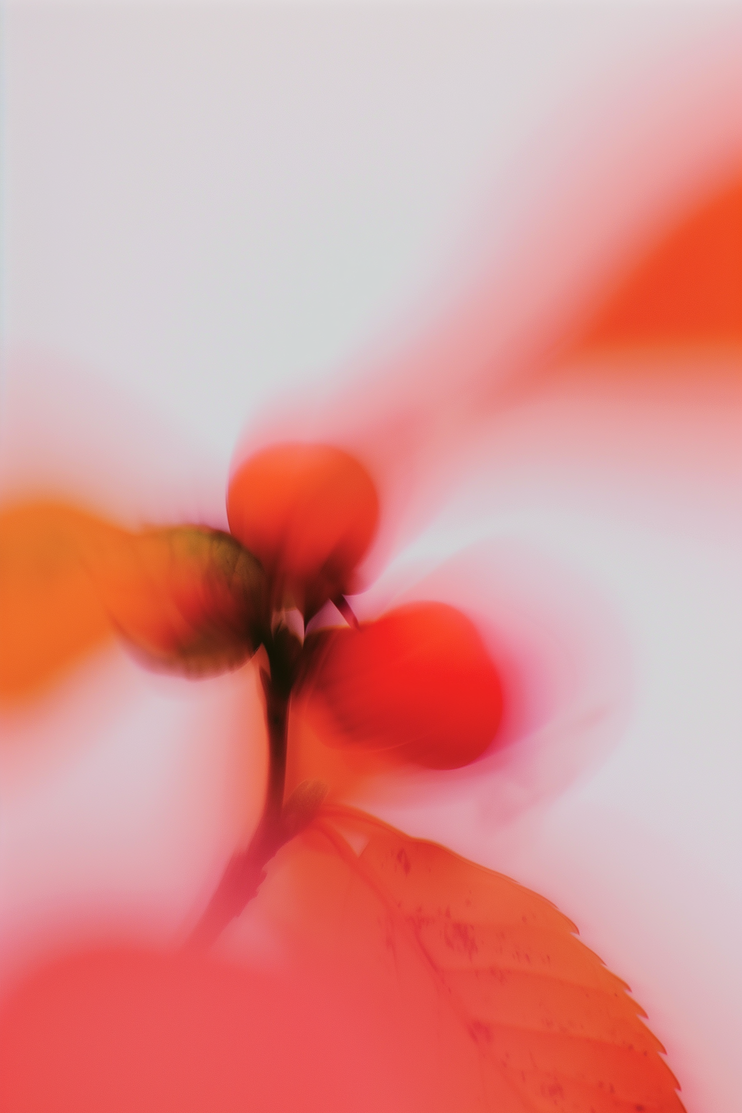 Abstract image of red-orange berries and green leaves in soft focus, blending into a dreamy, ethereal composition with vibrant hues.
