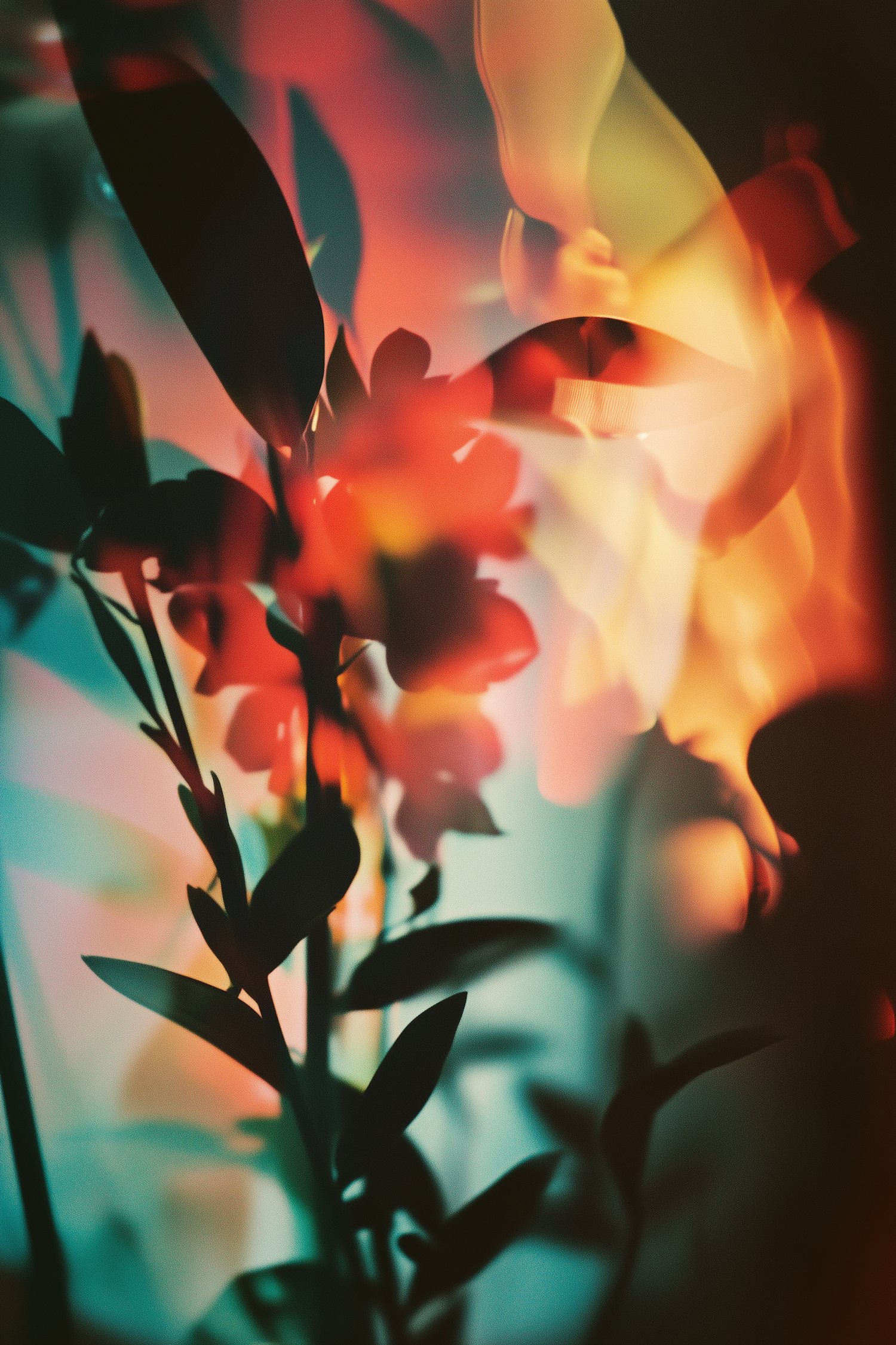 Abstract silhouette of plants with vibrant red, orange, and teal hues blending in a dreamy, blurred background. Artistic and ethereal vibe.