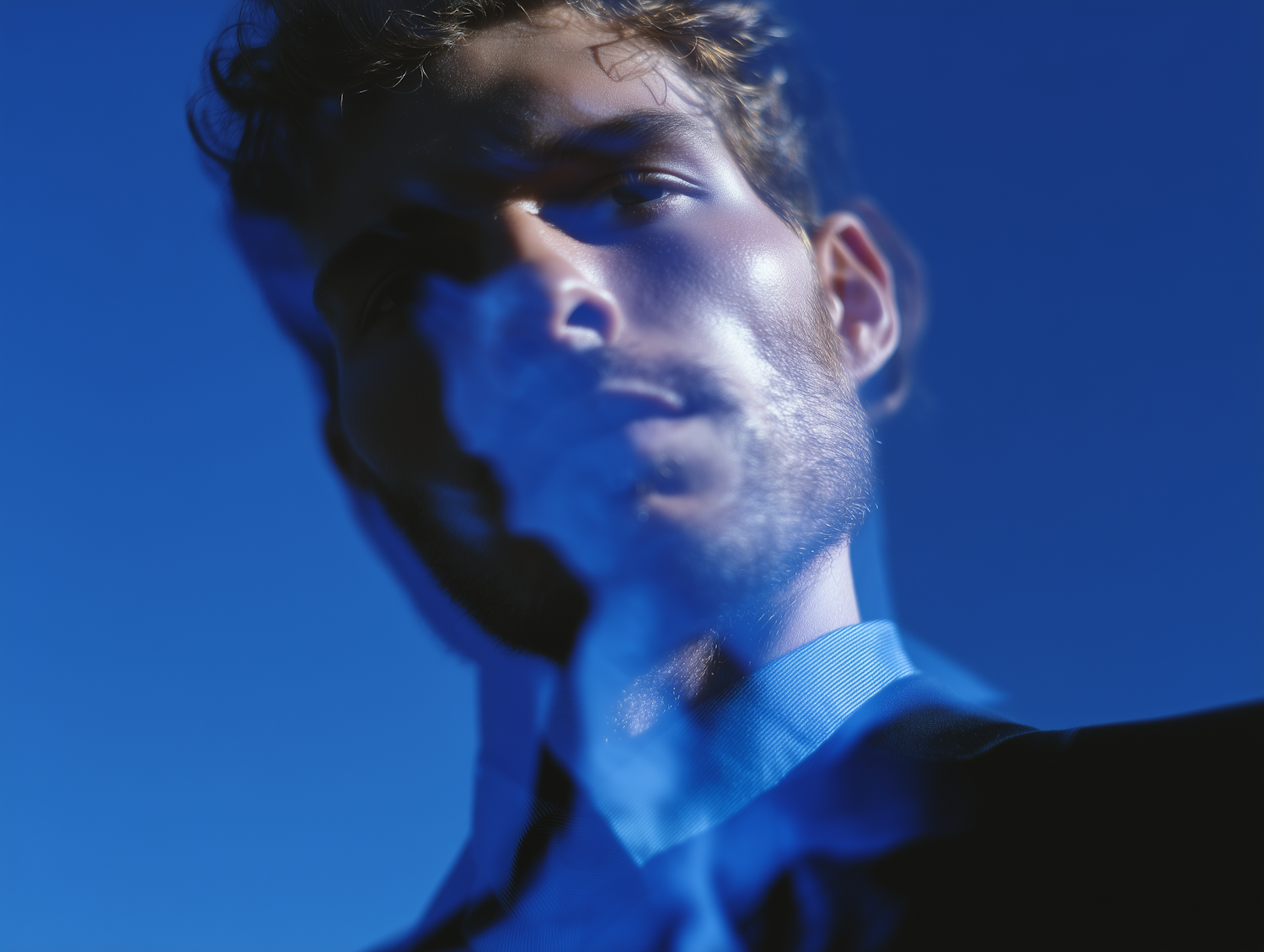 Abstract close-up of a man with curly hair and a beard, bathed in blue tones with a surreal, distorted effect.