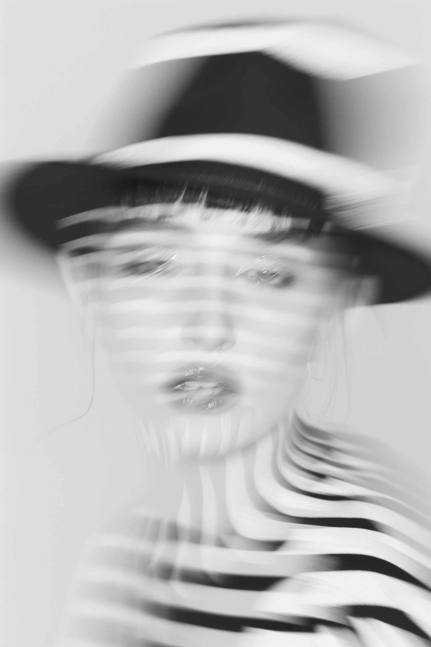 Abstract black-and-white portrait with motion blur, featuring a person in a striped shirt and hat, creating a surreal and artistic effect.