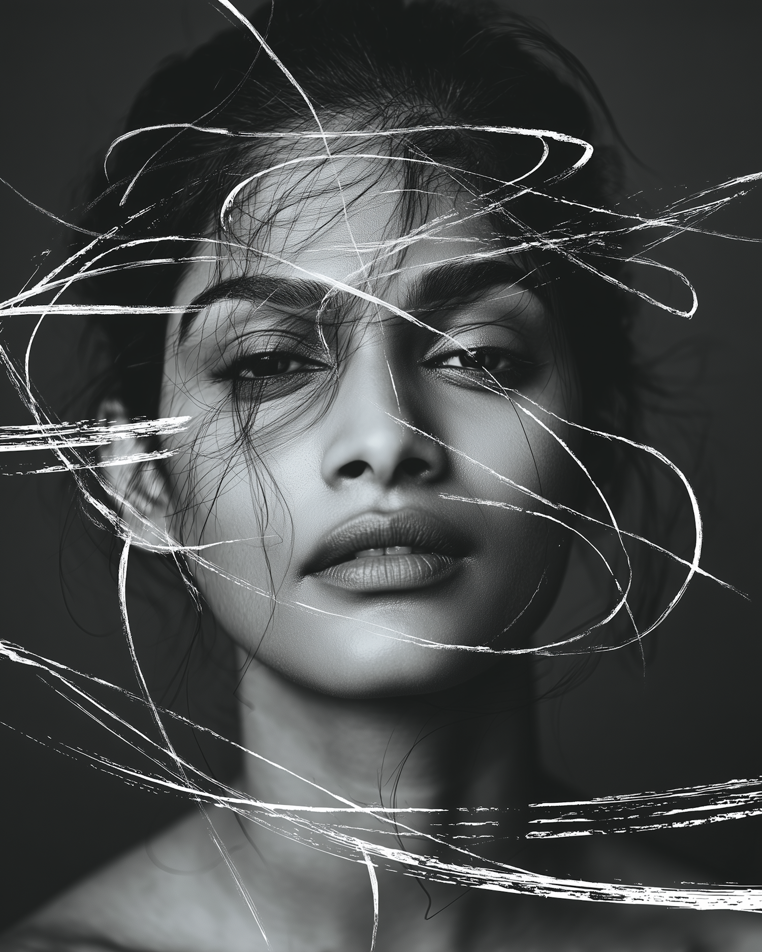 Monochromatic portrait of a woman with artistic white brushstroke overlays, creating a dynamic and abstract visual effect.