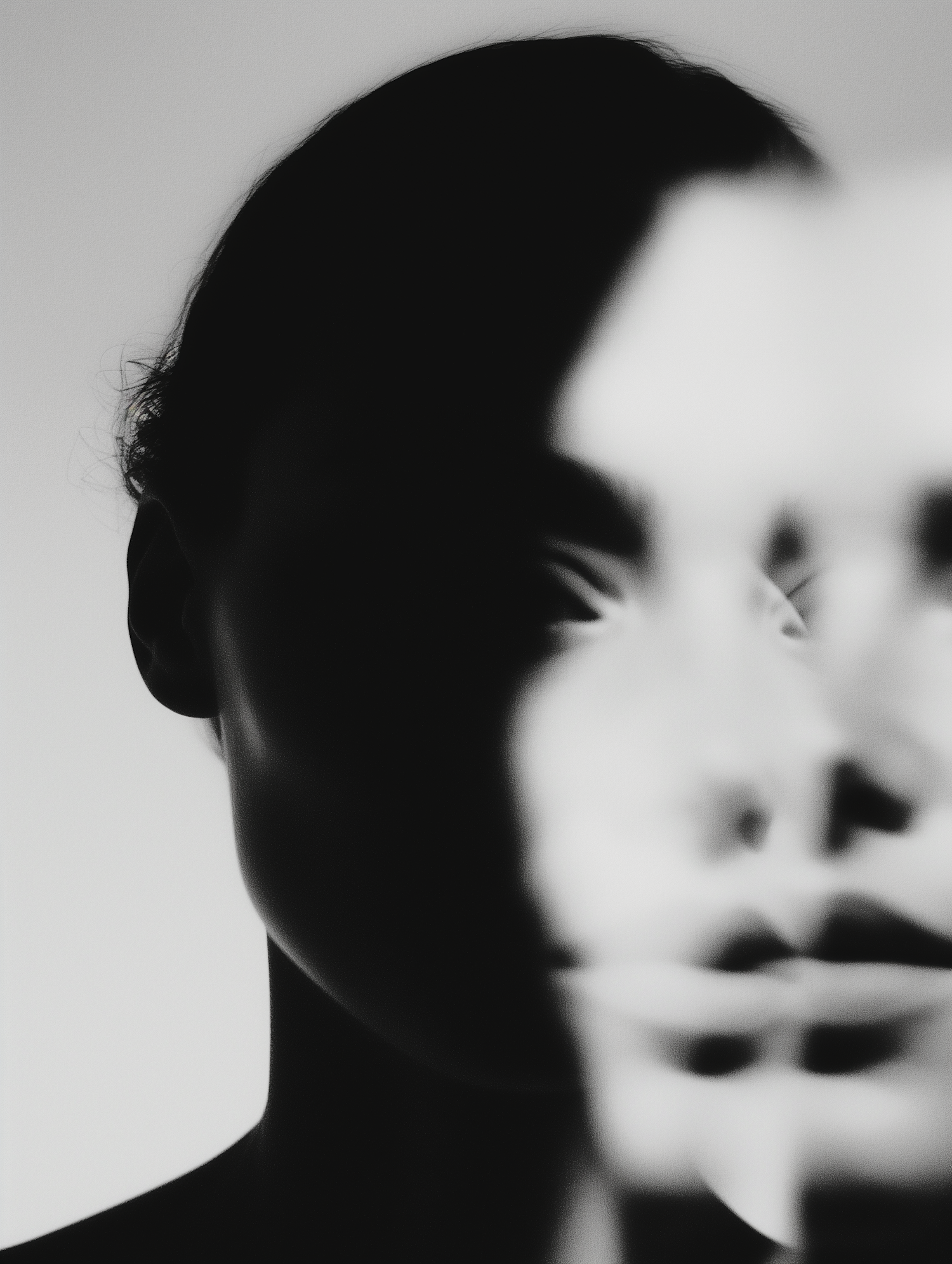 Abstract black-and-white portrait with blurred, overlapping faces and stark light-shadow contrast for a surreal effect.