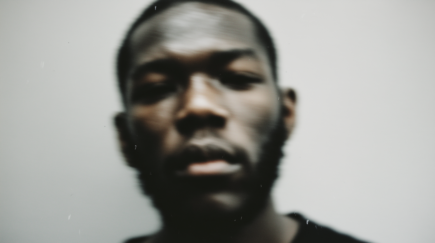 Blurred close-up portrait of a man with a beard against a plain light background, creating an abstract and artistic effect.