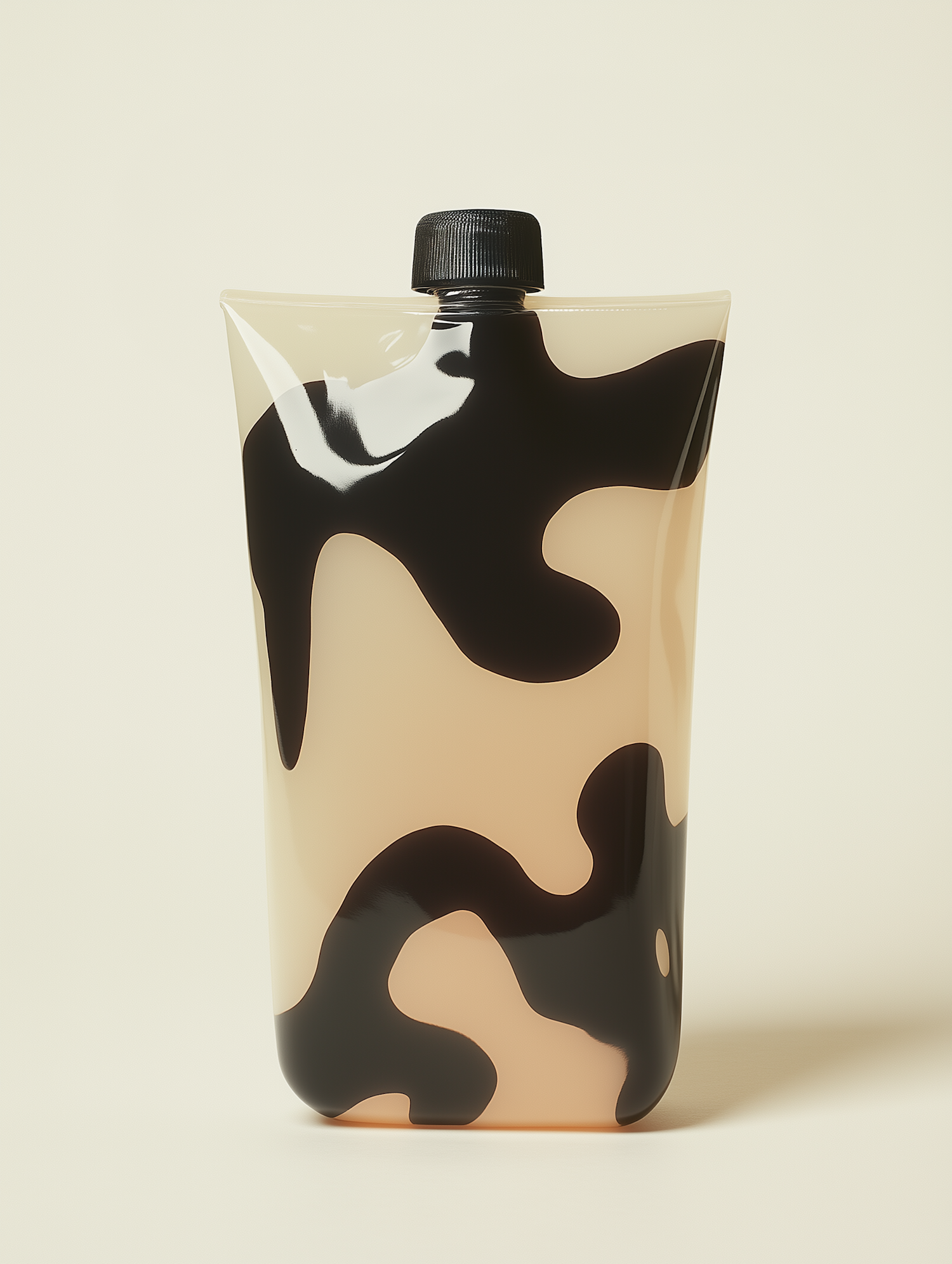 Stylish beige pouch with bold black abstract patterns and a screw-on cap, perfect for liquids or semi-liquid storage.