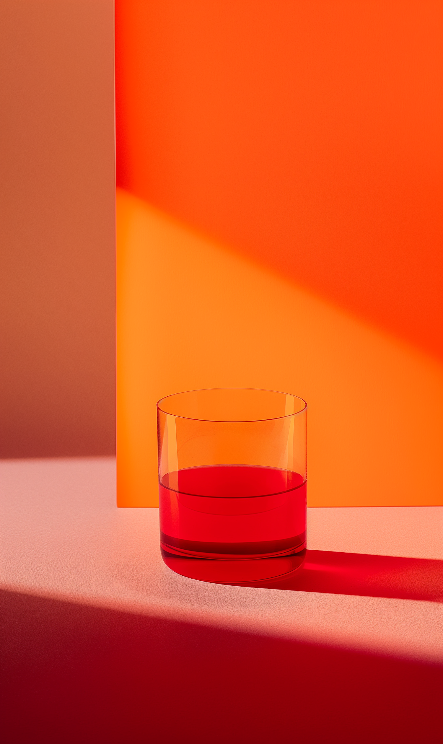 Minimalist scene with a glass of red liquid against a bold orange background, highlighting vibrant color contrast and sharp shadows.